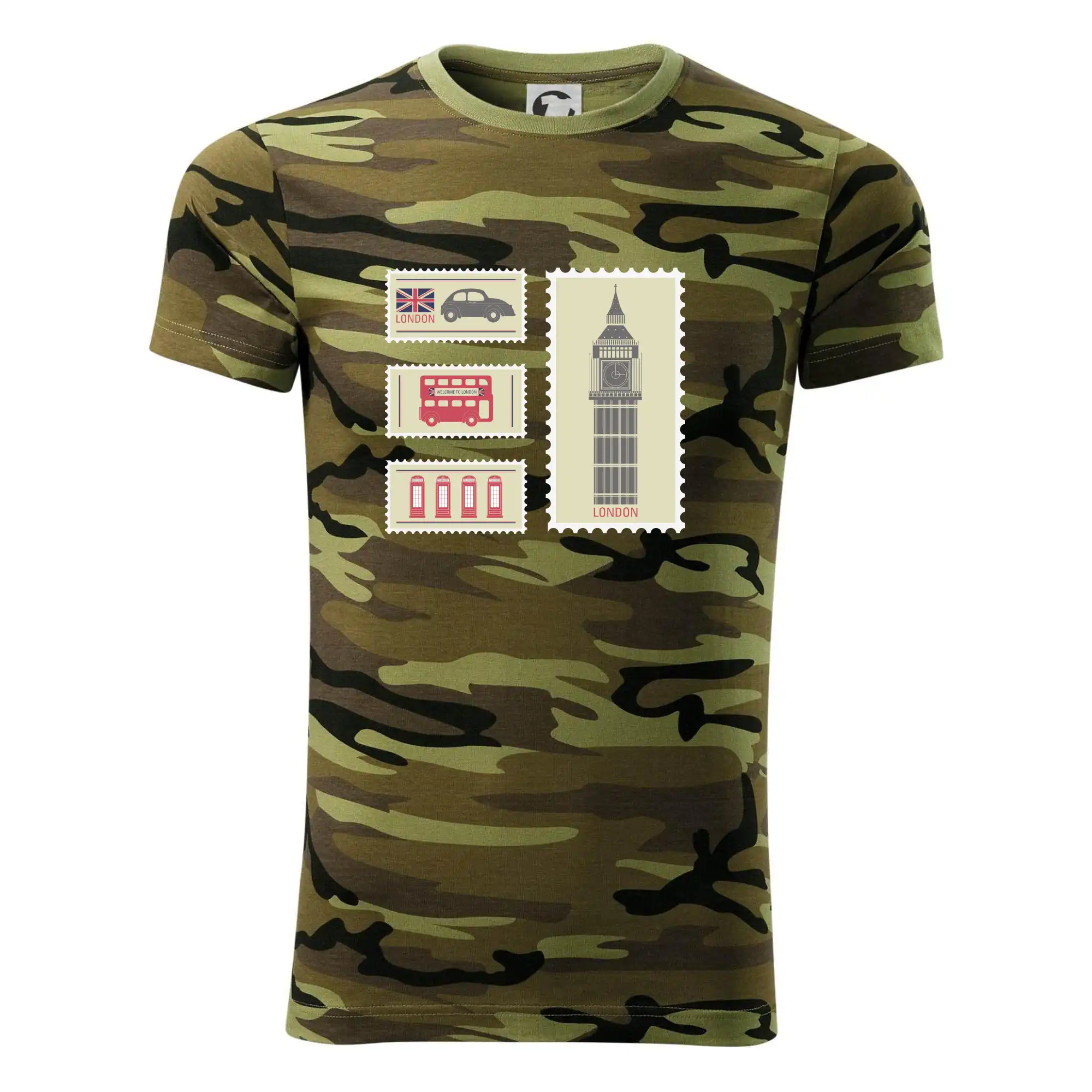 Tričko strednej gramáže vo farbách camouflage. Strih s bočnými švami. Lem priekrčníku z rebrového úpletu s prídavkom 5% elastanu. Vnútorná časť zadného priekrčníka začistená páskou vo farbe camouflage.