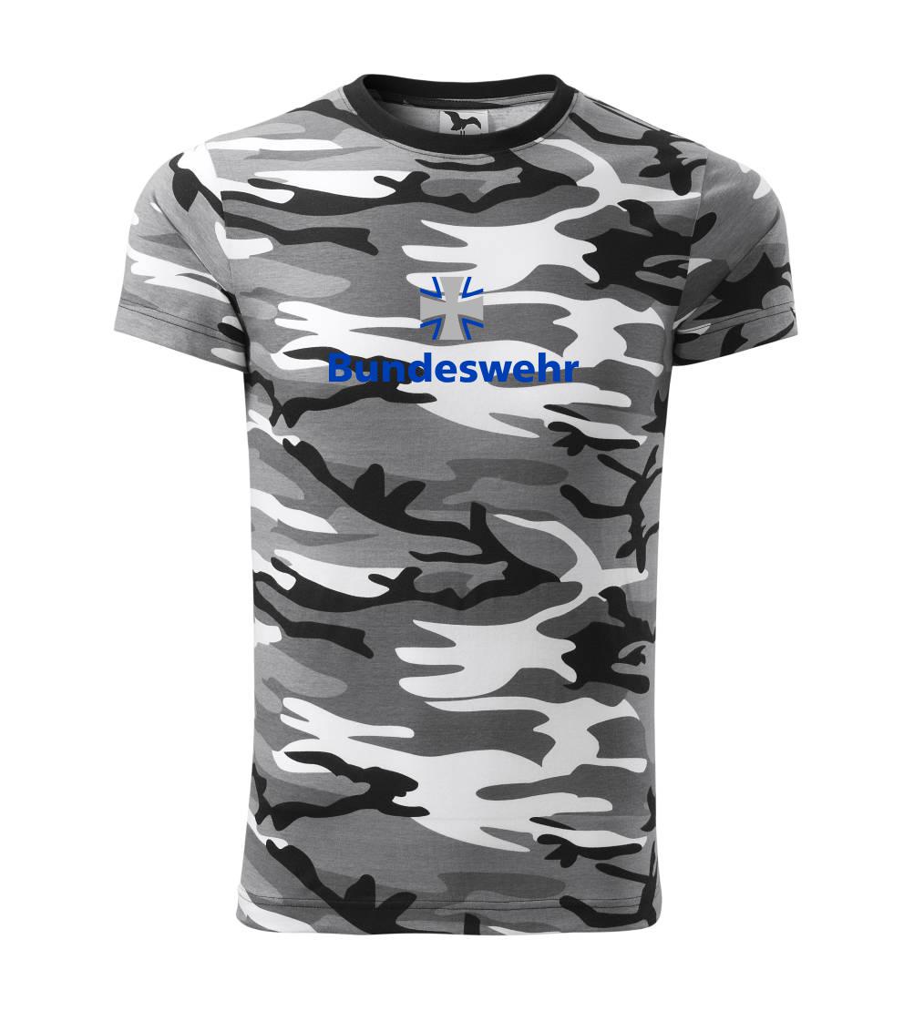 Tričko strednej gramáže vo farbách camouflage. Strih s bočnými švami. Lem priekrčníku z rebrového úpletu s prídavkom 5% elastanu. Vnútorná časť zadného priekrčníka začistená páskou vo farbe camouflage.