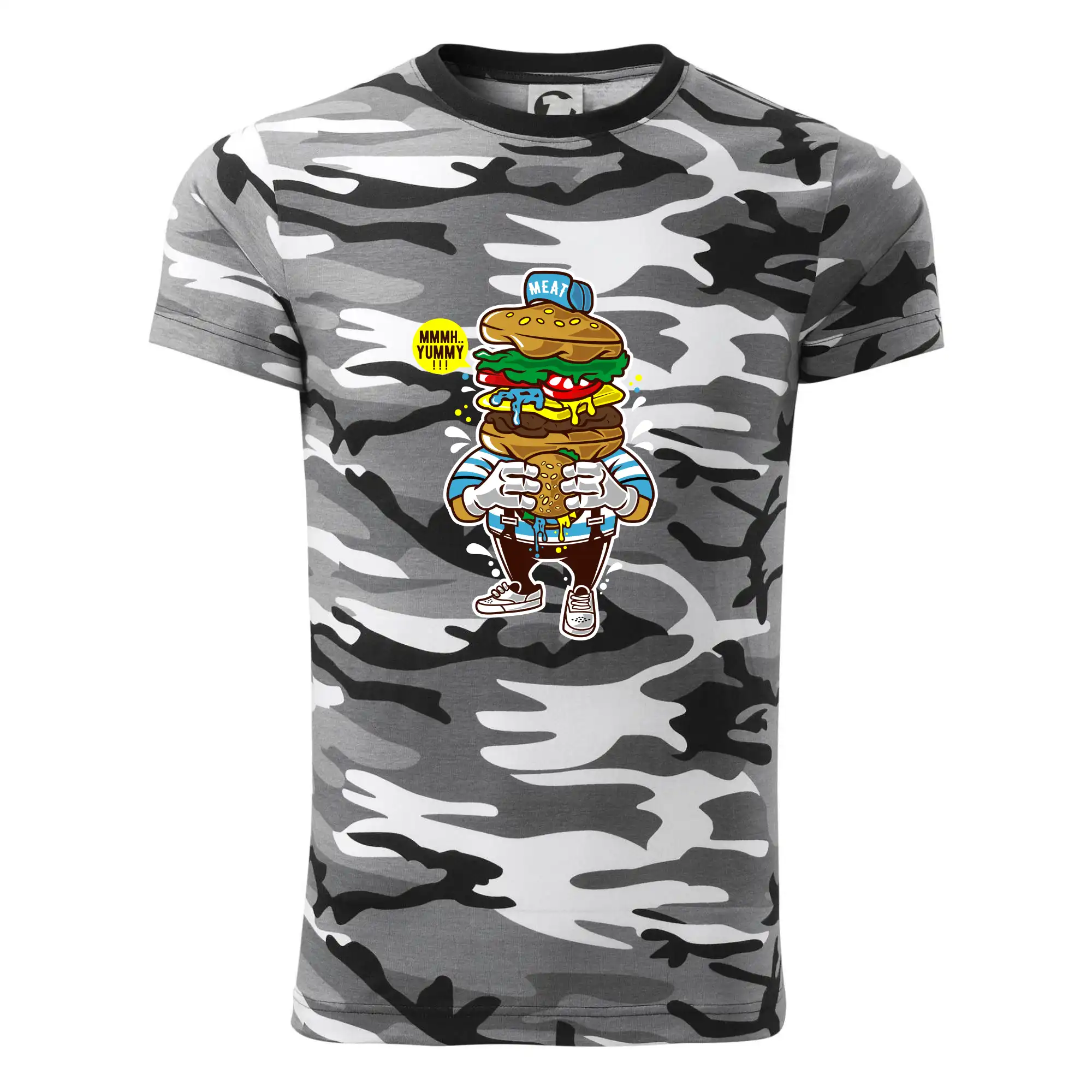 Tričko strednej gramáže vo farbách camouflage. Strih s bočnými švami. Lem priekrčníku z rebrového úpletu s prídavkom 5% elastanu. Vnútorná časť zadného priekrčníka začistená páskou vo farbe camouflage.