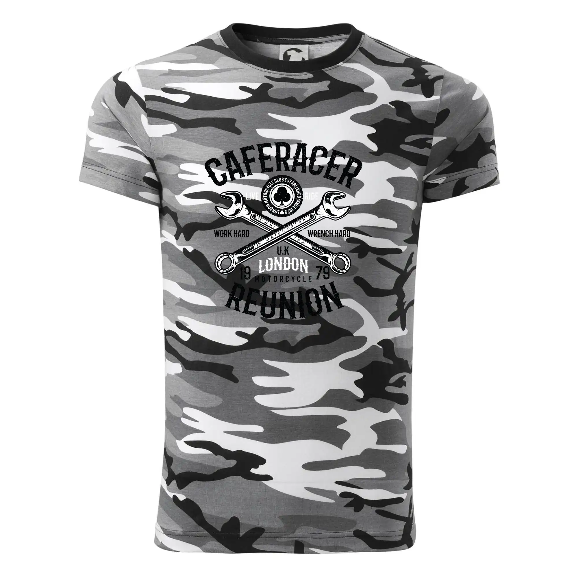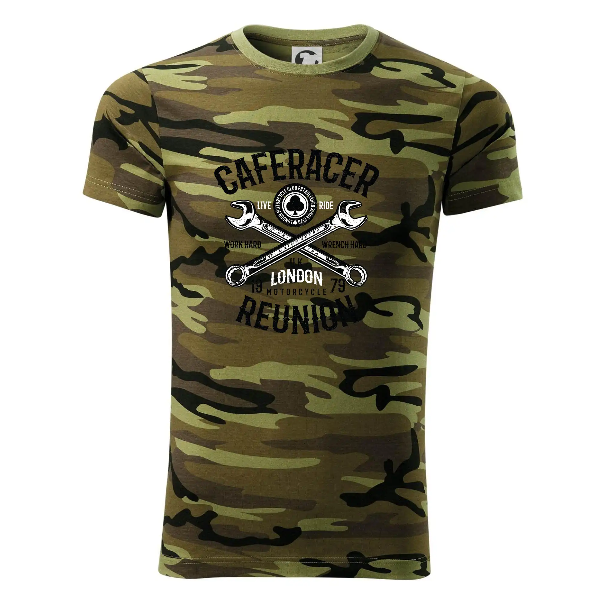 Tričko strednej gramáže vo farbách camouflage. Strih s bočnými švami. Lem priekrčníku z rebrového úpletu s prídavkom 5% elastanu. Vnútorná časť zadného priekrčníka začistená páskou vo farbe camouflage.