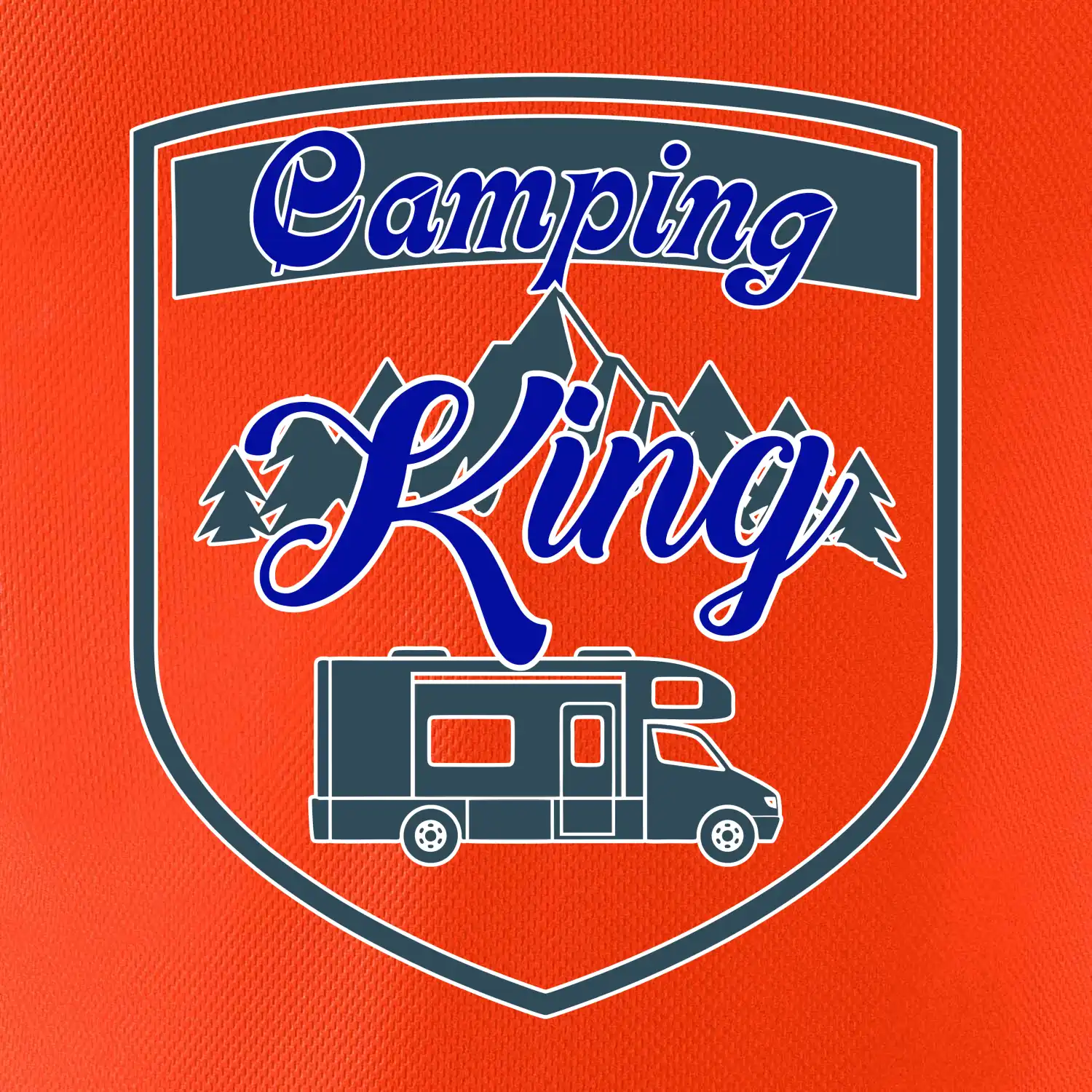 Toto tričko nosí kempingový kráľ. Vhodný darček pre milovníkov kempu. Na tričku je obytnú voz, hory a les.