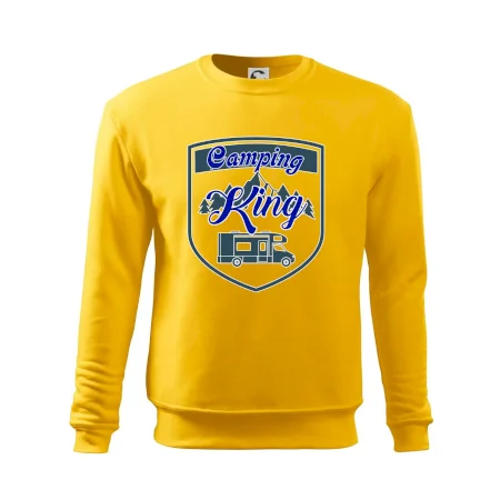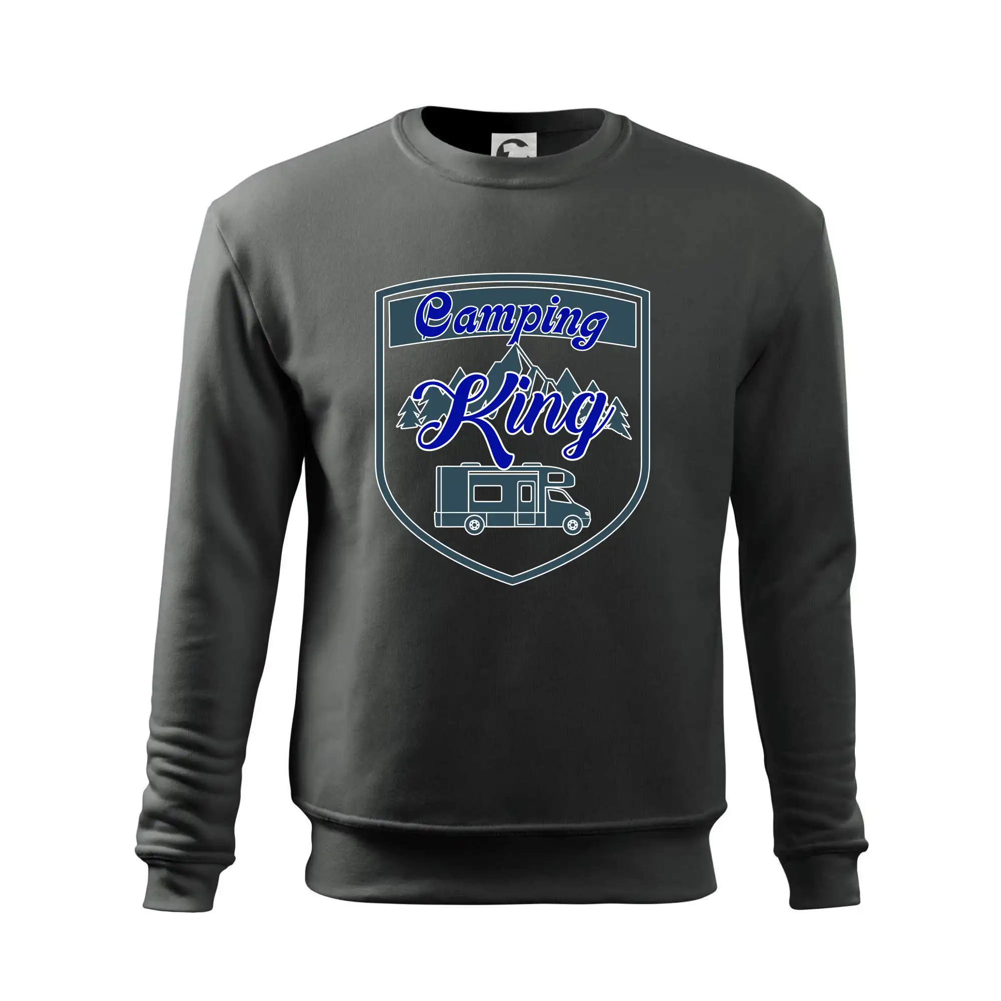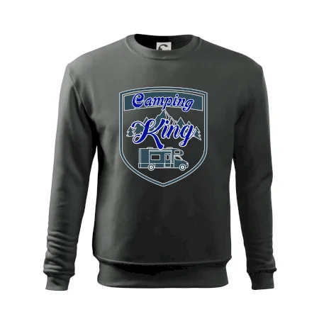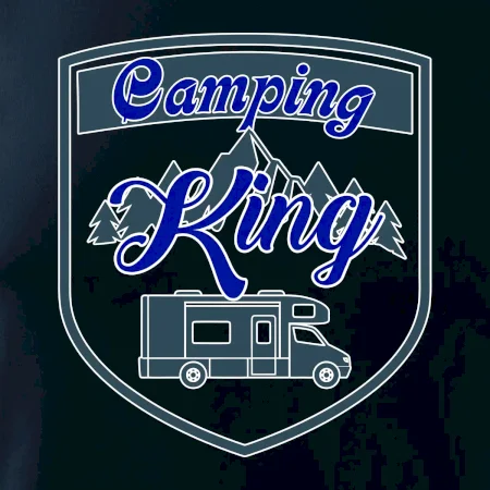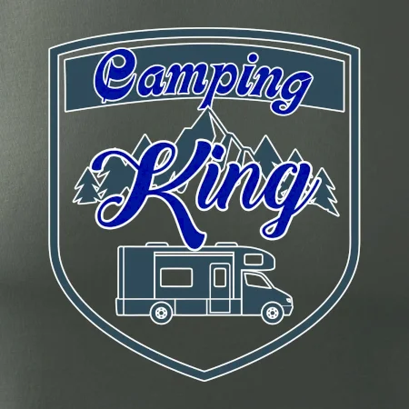 Toto tričko nosí kempingový kráľ. Vhodný darček pre milovníkov kempu. Na tričku je obytnú voz, hory a les.