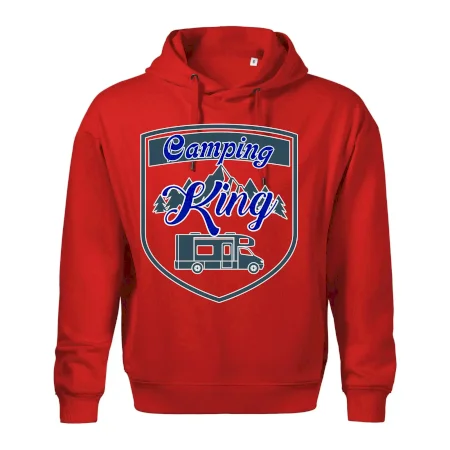 Toto tričko nosí kempingový kráľ. Vhodný darček pre milovníkov kempu. Na tričku je obytnú voz, hory a les.