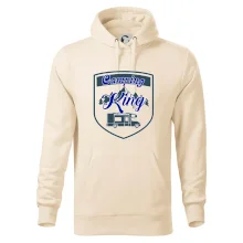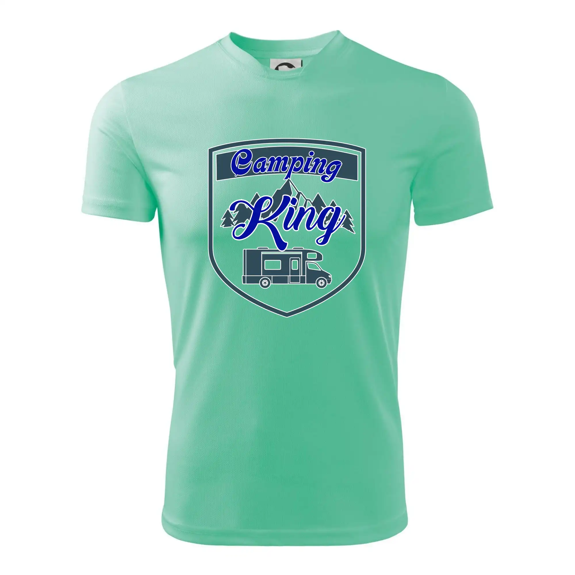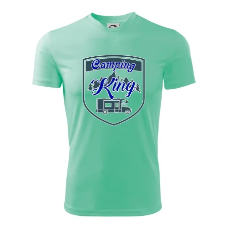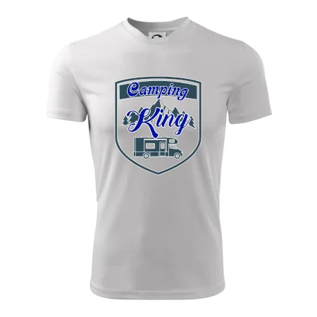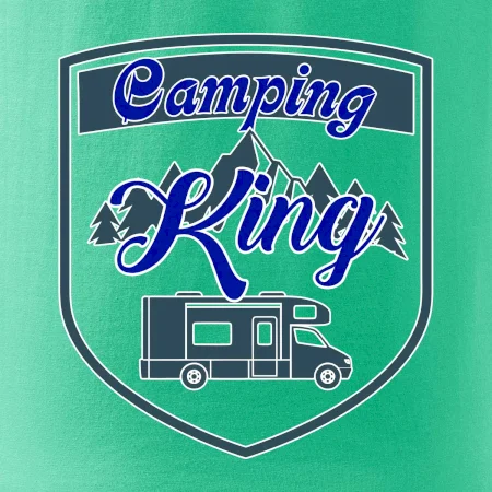 Toto tričko nosí kempingový kráľ. Vhodný darček pre milovníkov kempu. Na tričku je obytnú voz, hory a les.