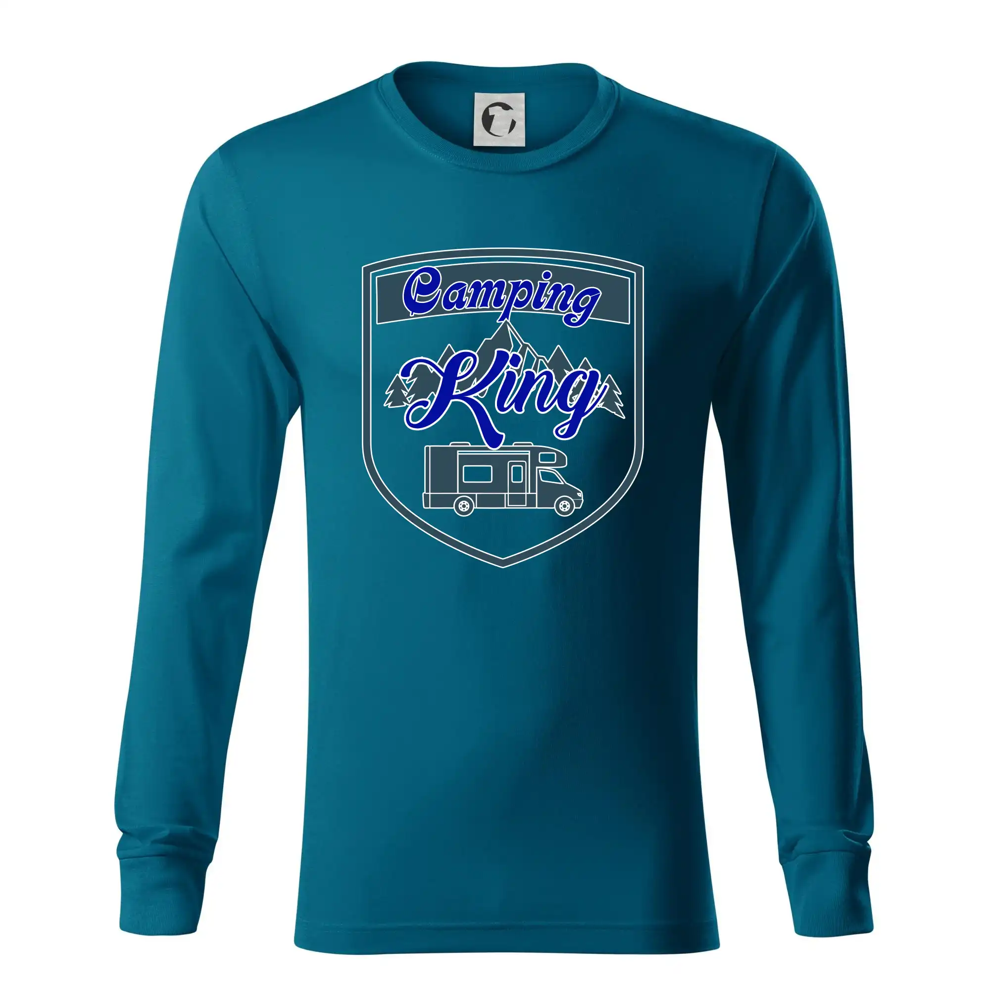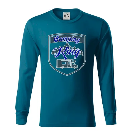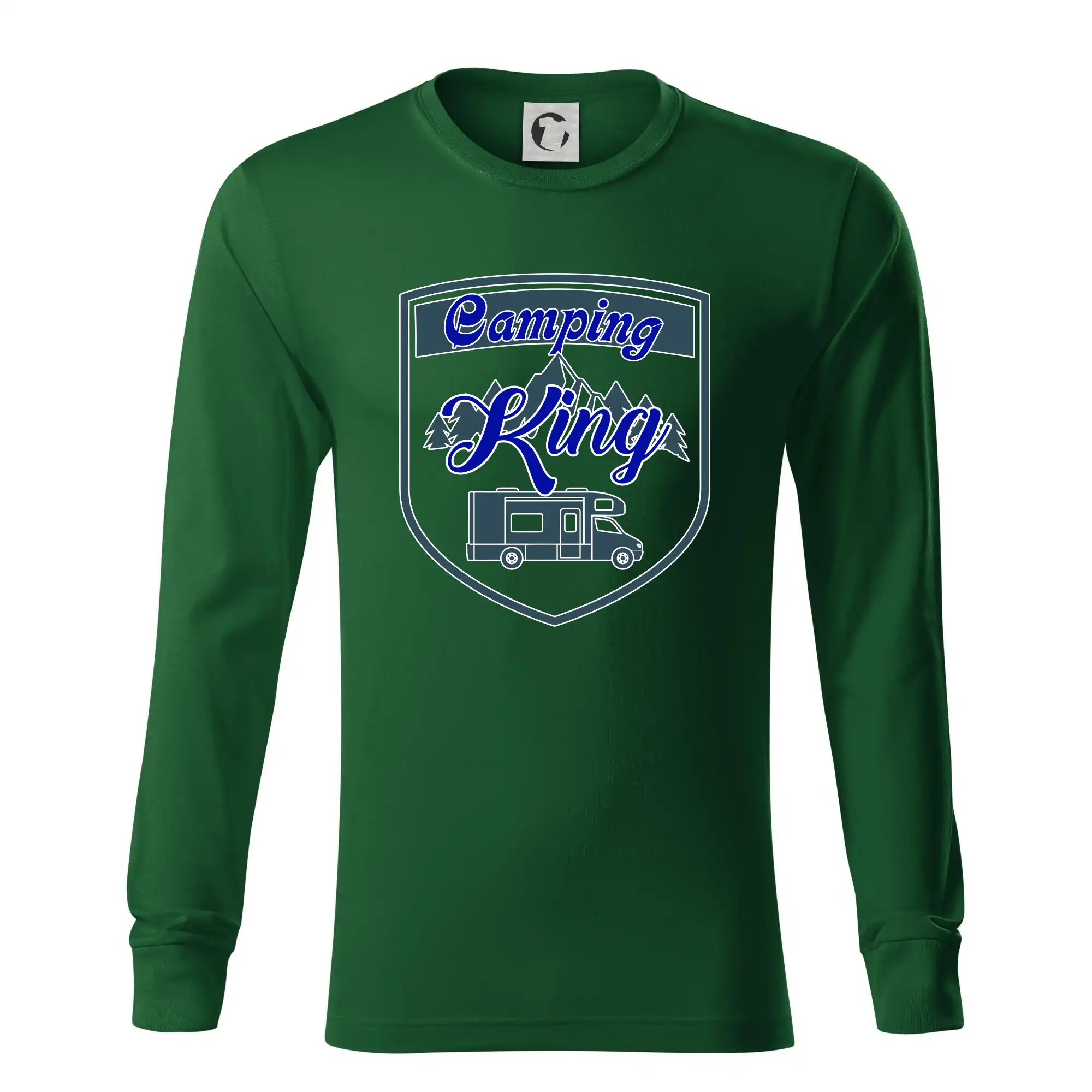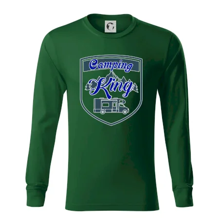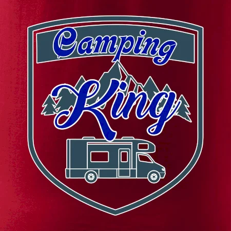 Toto tričko nosí kempingový kráľ. Vhodný darček pre milovníkov kempu. Na tričku je obytnú voz, hory a les.