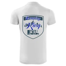Toto tričko nosí kempingový kráľ. Vhodný darček pre milovníkov kempu. Na tričku je obytnú voz, hory a les.