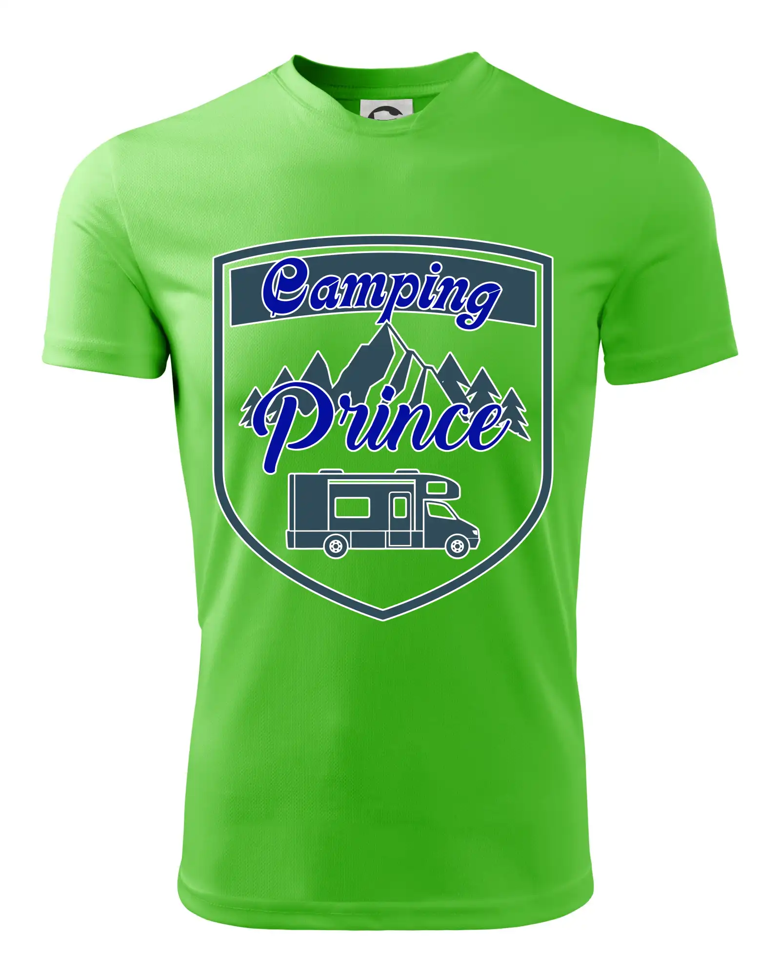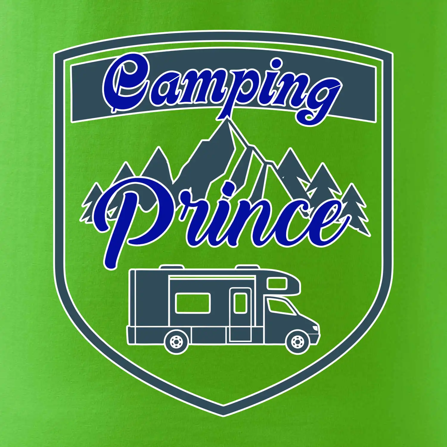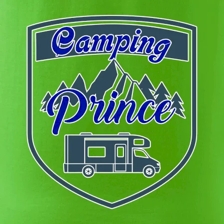 Toto tričko nosí kempingový kráľ. Vhodný darček pre milovníkov kempu. Na tričku je obytnú voz, hory a les.