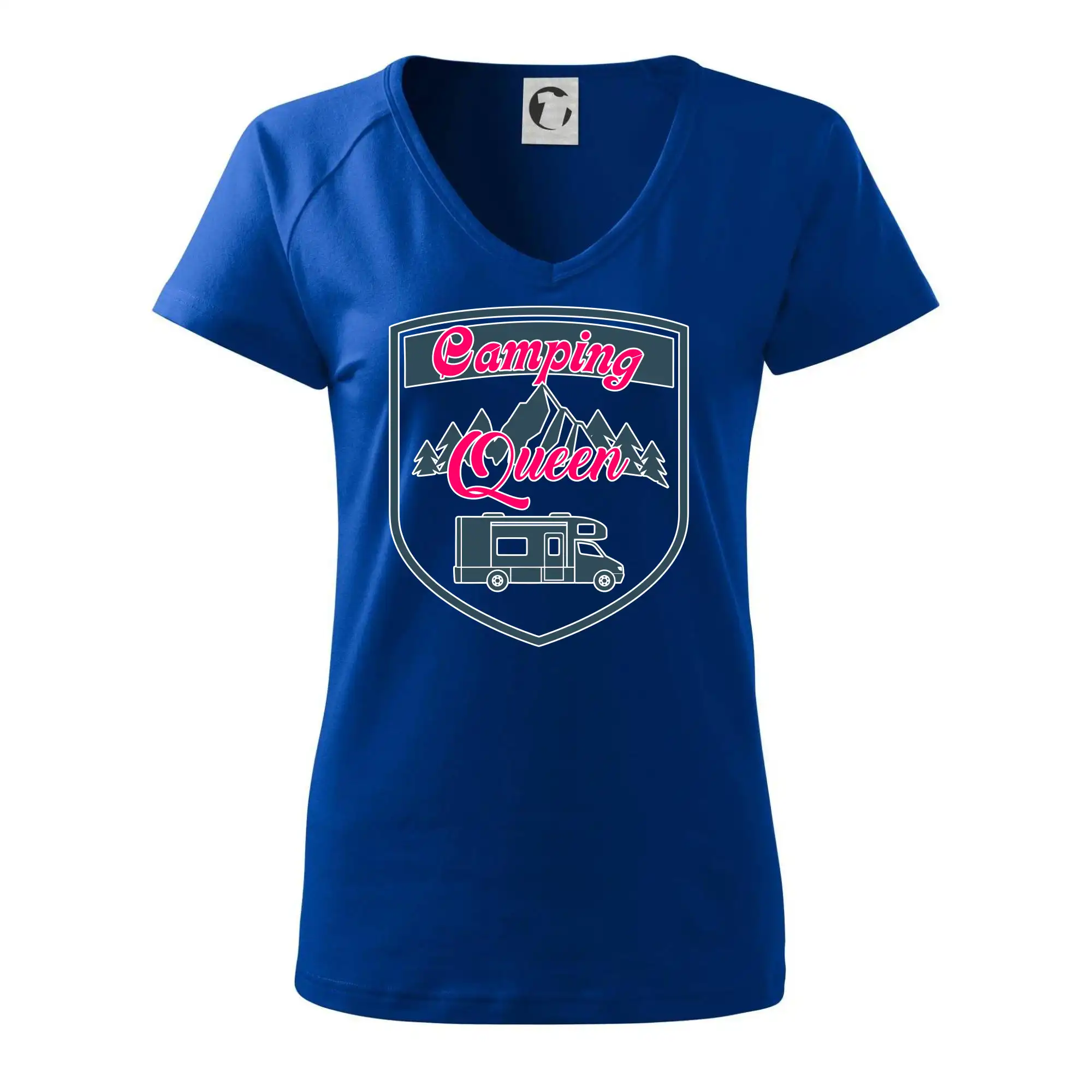 Toto tričko nosí kempingový kráľ. Vhodný darček pre milovníkov kempu. Na tričku je obytnú voz, hory a les.