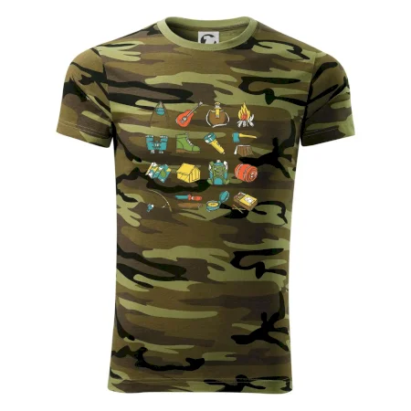 Toto tričko pre kempistov Ti môže poslúžiť ako zoznam vecí, ktoré sa máš vziať na čunder. Odškrtávaj si: gitara, ešus, čutora, ďalekohľad, baterka, sekerka, spacák, stan, mapa, sirky, kompas, nôž, zápalky...máš všetko? Potom môžeš vyraziť a prežiť poriadne dobrodružstvo pri kempovaní v lese.