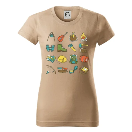 Toto tričko pre kempistov Ti môže poslúžiť ako zoznam vecí, ktoré sa máš vziať na čunder. Odškrtávaj si: gitara, ešus, čutora, ďalekohľad, baterka, sekerka, spacák, stan, mapa, sirky, kompas, nôž, zápalky...máš všetko? Potom môžeš vyraziť a prežiť poriadne dobrodružstvo pri kempovaní v lese.