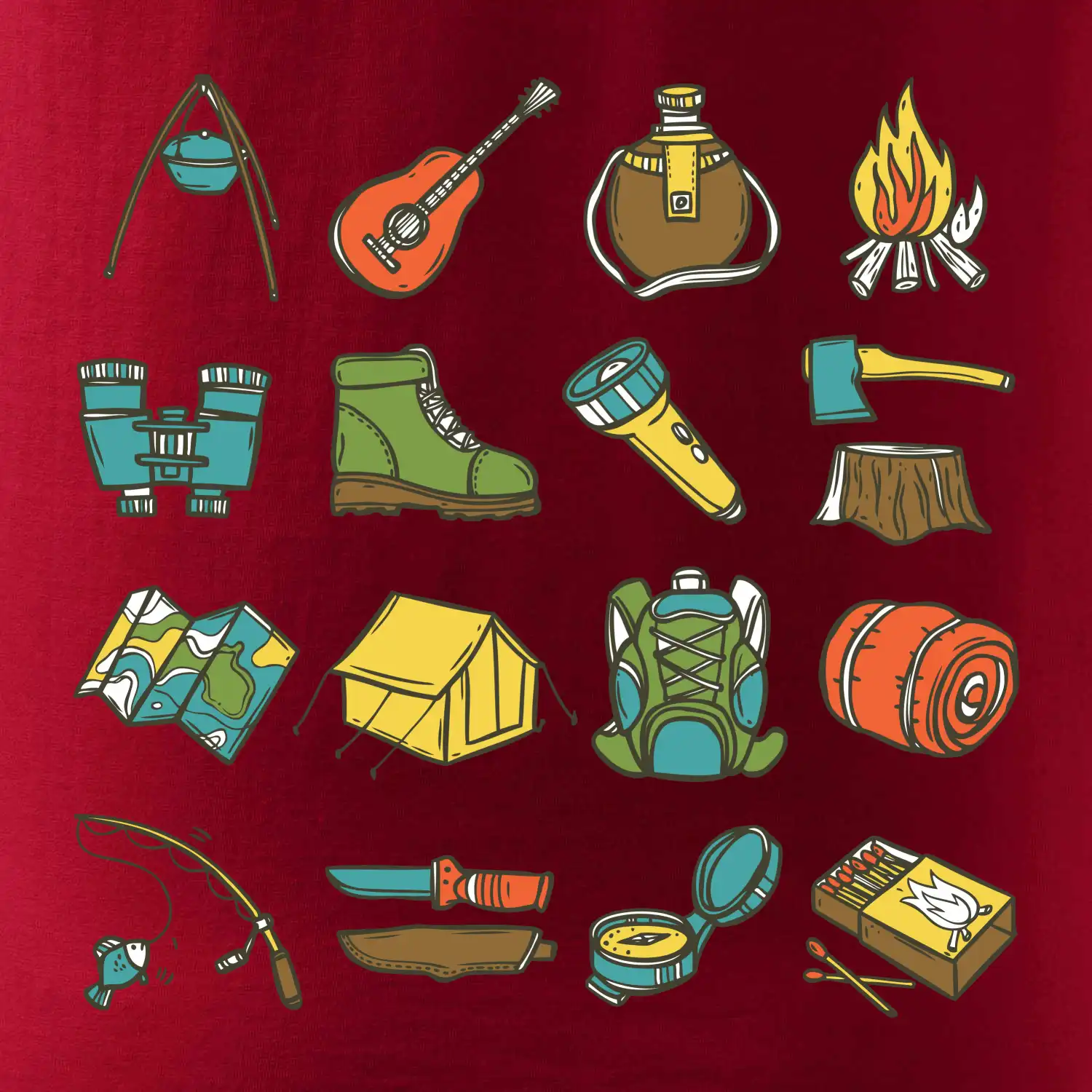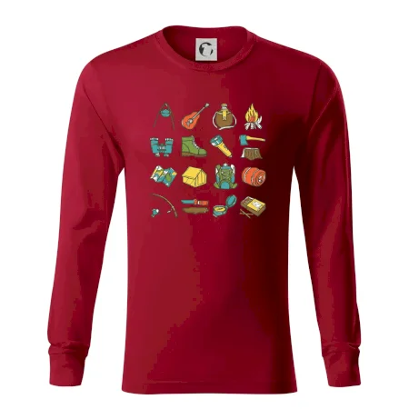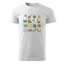 Toto tričko pre kempistov Ti môže poslúžiť ako zoznam vecí, ktoré sa máš vziať na čunder. Odškrtávaj si: gitara, ešus, čutora, ďalekohľad, baterka, sekerka, spacák, stan, mapa, sirky, kompas, nôž, zápalky...máš všetko? Potom môžeš vyraziť a prežiť poriadne dobrodružstvo pri kempovaní v lese.