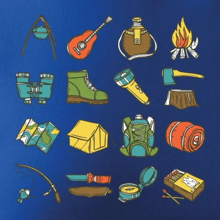 Toto tričko pre kempistov Ti môže poslúžiť ako zoznam vecí, ktoré sa máš vziať na čunder. Odškrtávaj si: gitara, ešus, čutora, ďalekohľad, baterka, sekerka, spacák, stan, mapa, sirky, kompas, nôž, zápalky...máš všetko? Potom môžeš vyraziť a prežiť poriadne dobrodružstvo pri kempovaní v lese.