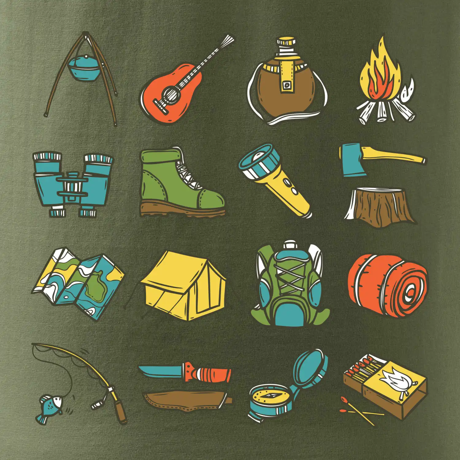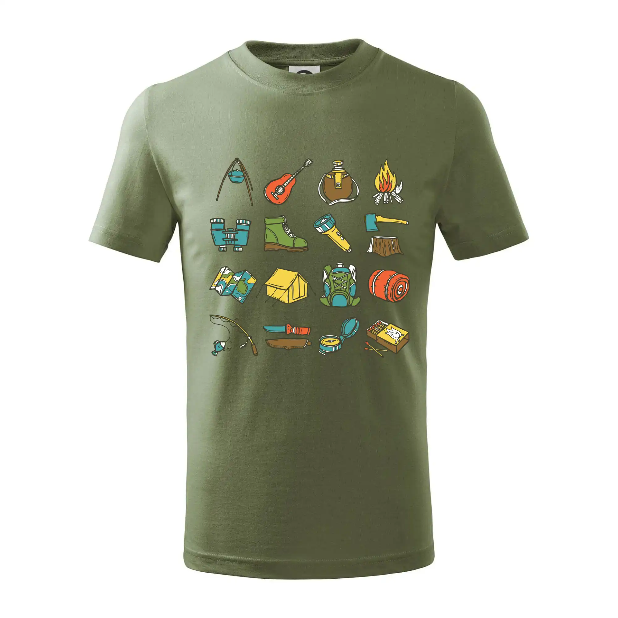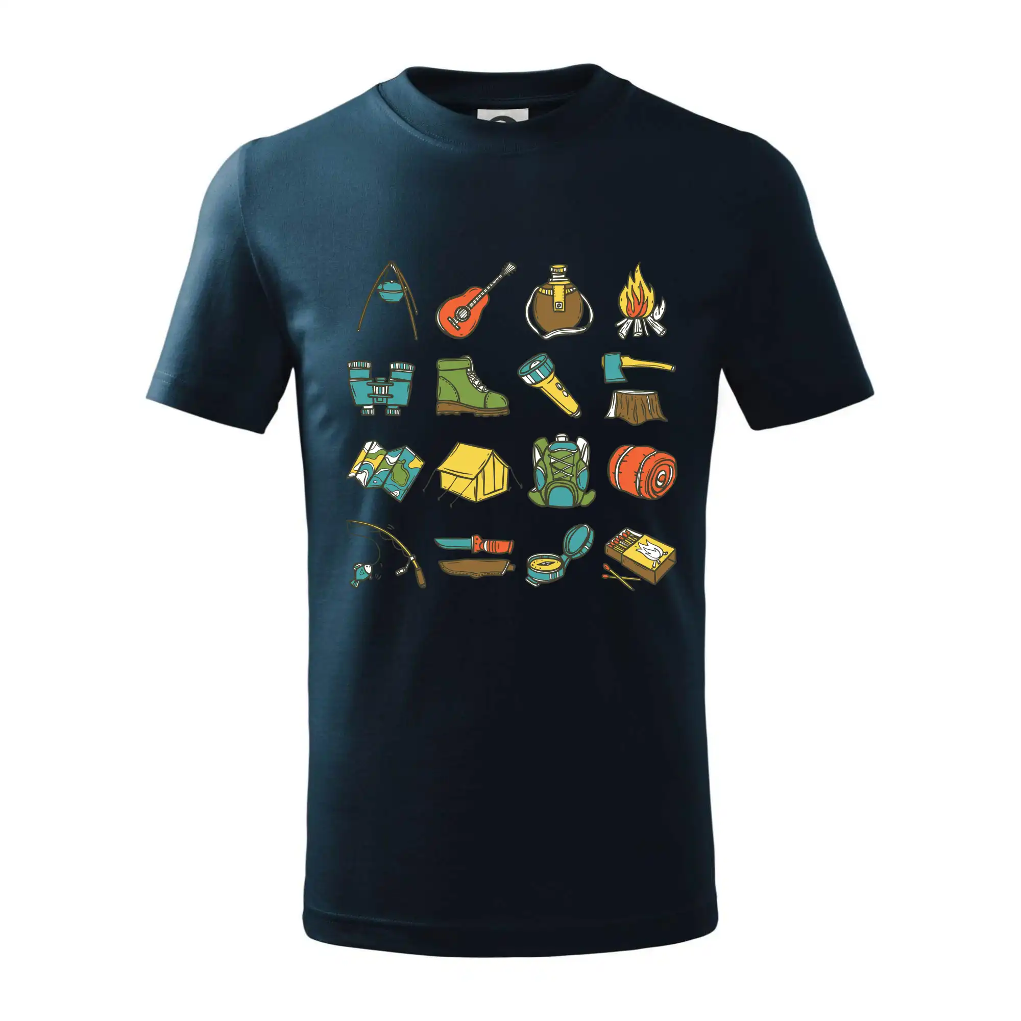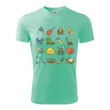 Toto tričko pre kempistov Ti môže poslúžiť ako zoznam vecí, ktoré sa máš vziať na čunder. Odškrtávaj si: gitara, ešus, čutora, ďalekohľad, baterka, sekerka, spacák, stan, mapa, sirky, kompas, nôž, zápalky...máš všetko? Potom môžeš vyraziť a prežiť poriadne dobrodružstvo pri kempovaní v lese.