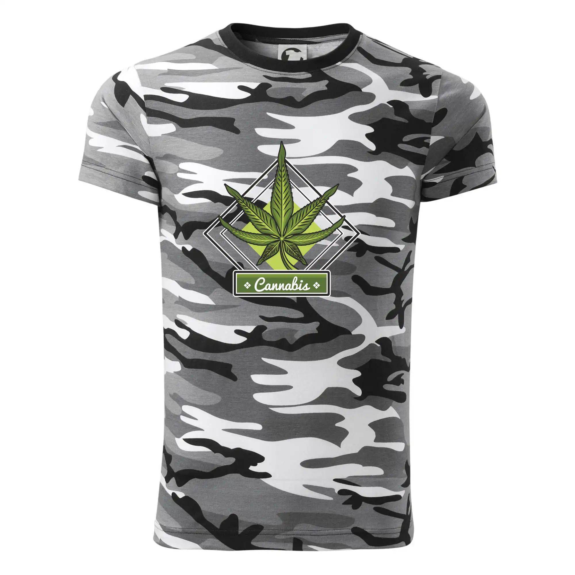 Tričko strednej gramáže vo farbách camouflage. Strih s bočnými švami. Lem priekrčníku z rebrového úpletu s prídavkom 5% elastanu. Vnútorná časť zadného priekrčníka začistená páskou vo farbe camouflage.