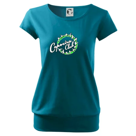 Trendové dámske tričko s veľmi krátkym rukávom, voľnejšieho strihu, v dolnom kraji všité do širokého lemu. Okrúhly priekrčník s úzkym lemom zo zhodného materiálu.
