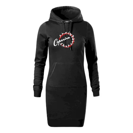 Dámske mikinové šaty MALFINI Snap 419 sú ideálnou voľbou pre ženy, ktoré hľadajú pohodlný a štýlový kúsok na voľný čas alebo každodenné nosenie. Ľahko vypasovaný strih s bočnými švami podčiarkuje ženskú siluetu, zatiaľ čo kapucňa s podšívkou a sťahovacou šnúrkou dodáva ležérny vzhľad. Šaty majú dĺžku nad kolená a sú vybavené našitým vreckom v štýle „klokanky“. Materiál je mäkký a príjemný na dotyk grâce à smesi bavlny a polyesteru s nepočesanou vnútornou stranou.
