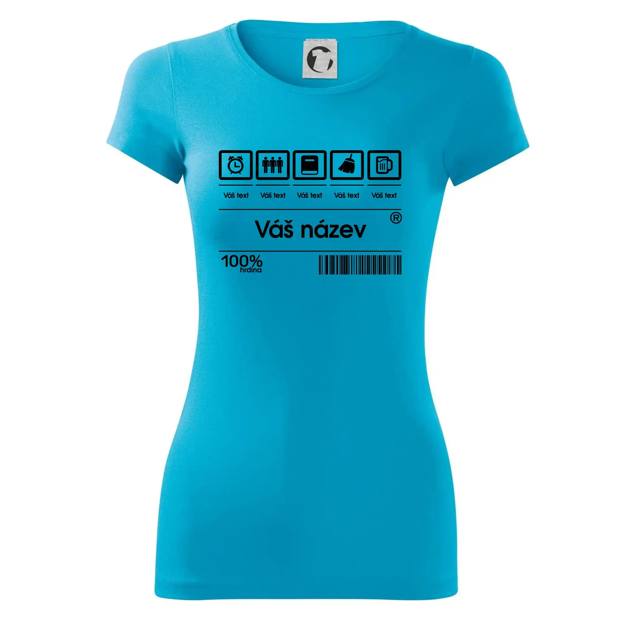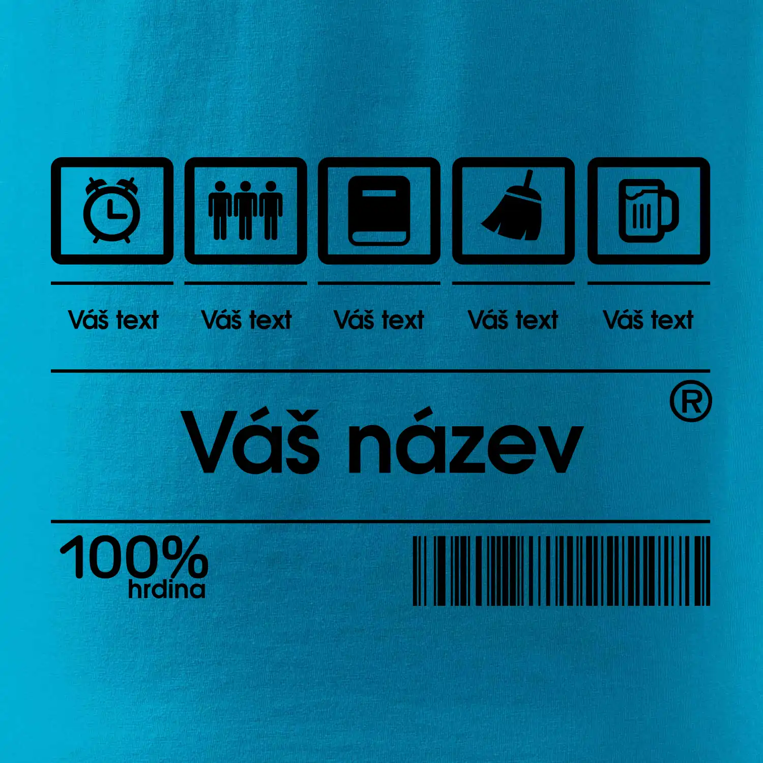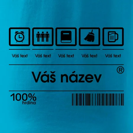 Do poznámky k objednávce nám napiš co chceš mít místo nápisu "vlastní text" a my doplníme ikonky, texty a budeš moct darovat naprosto originální triko. Tričko s originálním čárovým kódem pro každého. Čárový kód na přání!