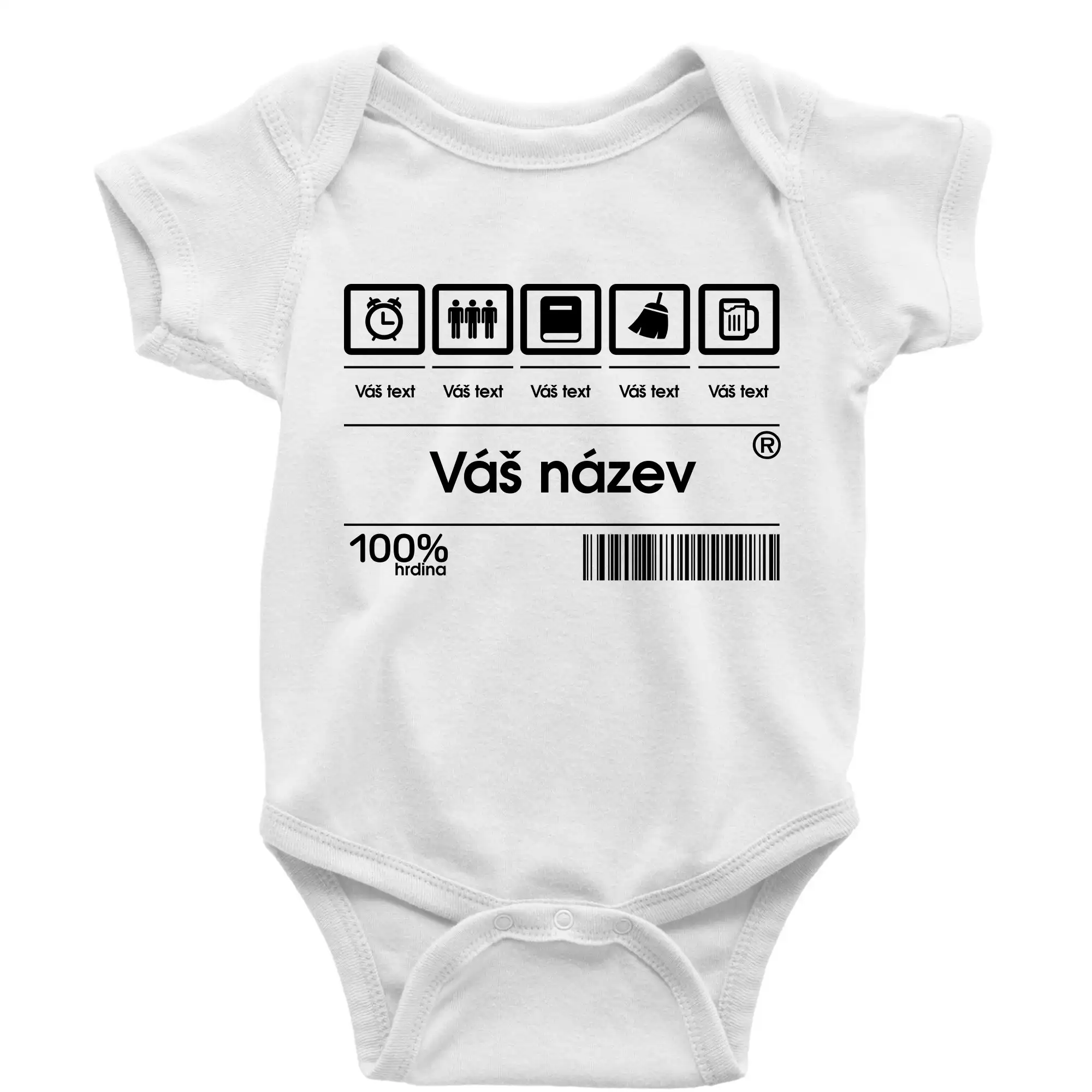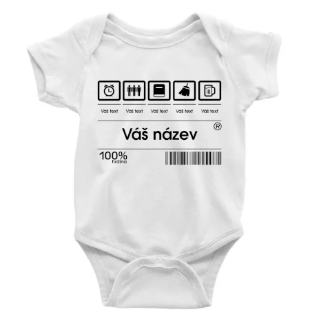 Do poznámky k objednávce nám napiš co chceš mít místo nápisu "vlastní text" a my doplníme ikonky, texty a budeš moct darovat naprosto originální triko. Tričko s originálním čárovým kódem pro každého. Čárový kód na přání!