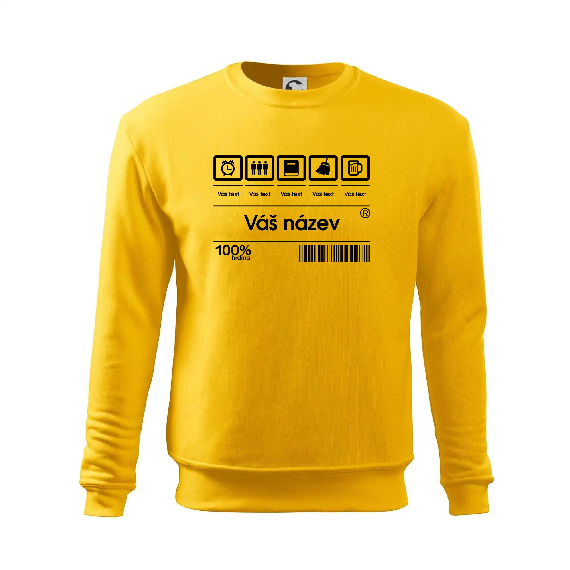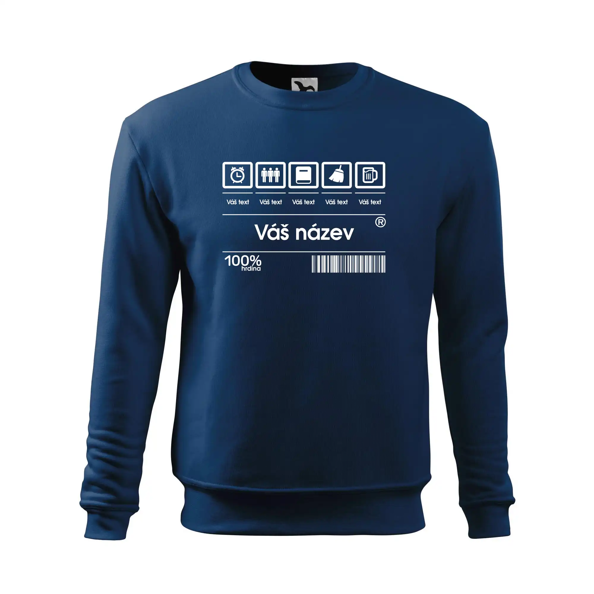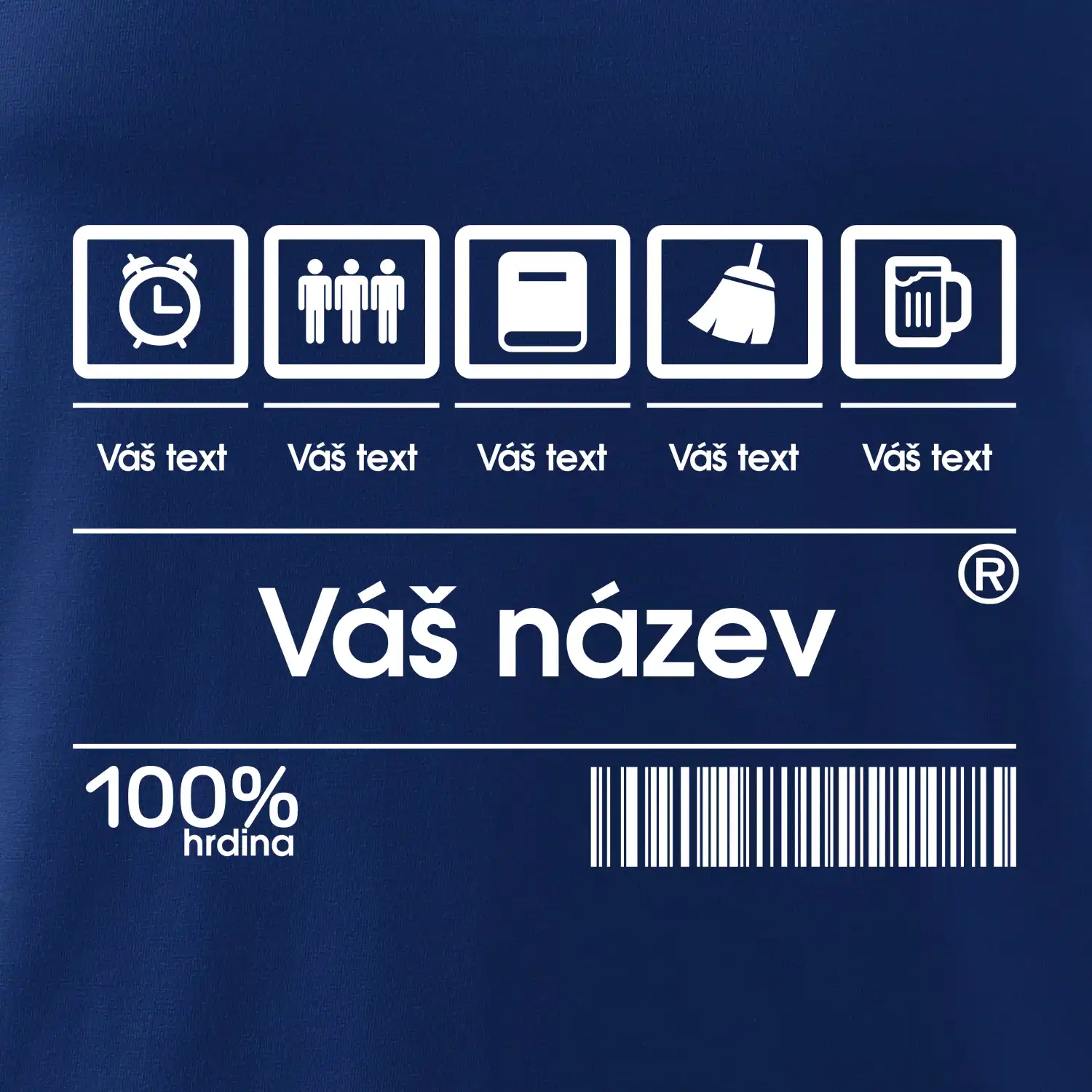 Do poznámky k objednávce nám napiš co chceš mít místo nápisu "vlastní text" a my doplníme ikonky, texty a budeš moct darovat naprosto originální triko. Tričko s originálním čárovým kódem pro každého. Čárový kód na přání!
