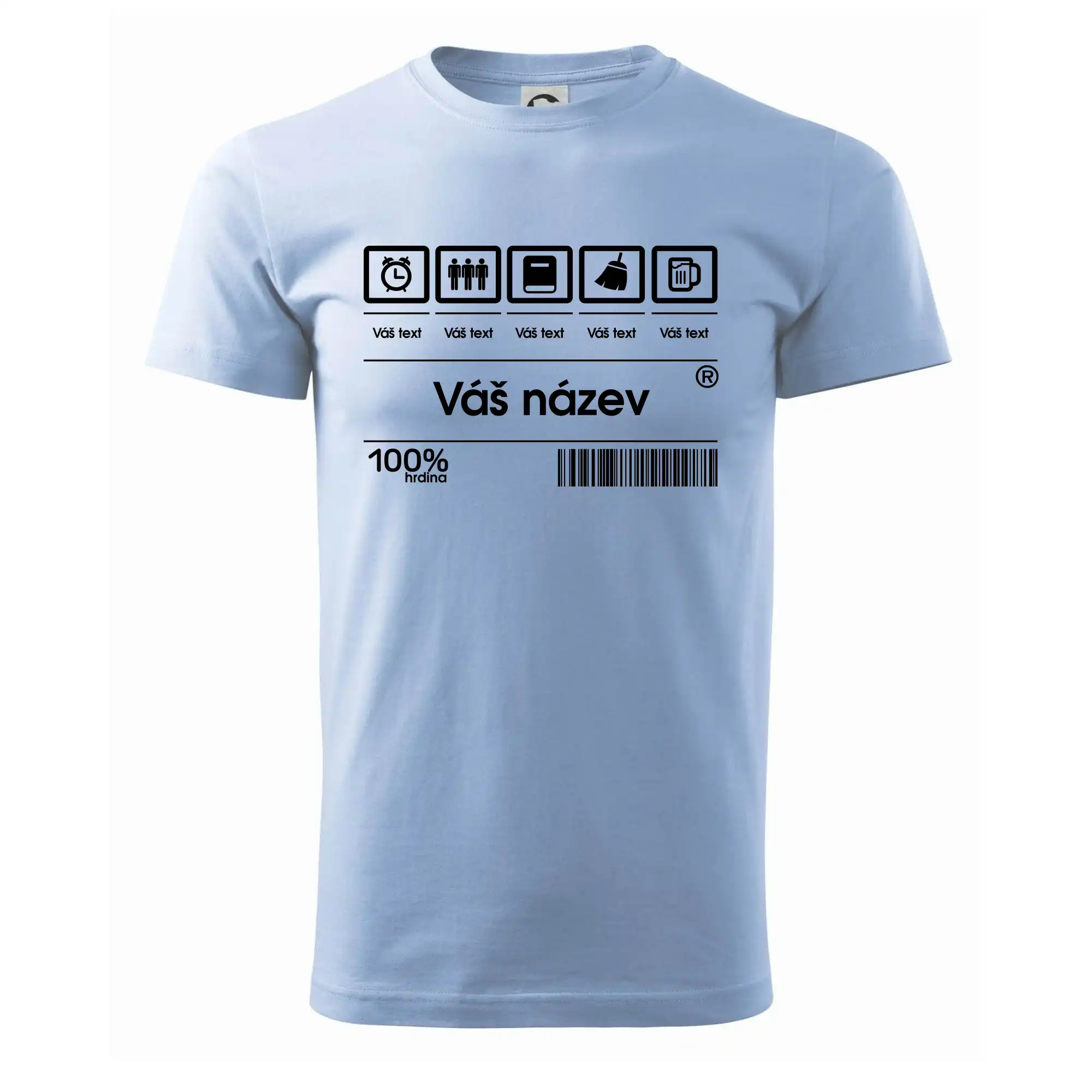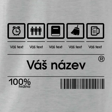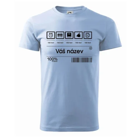 Do poznámky k objednávce nám napiš co chceš mít místo nápisu "vlastní text" a my doplníme ikonky, texty a budeš moct darovat naprosto originální triko. Tričko s originálním čárovým kódem pro každého. Čárový kód na přání!