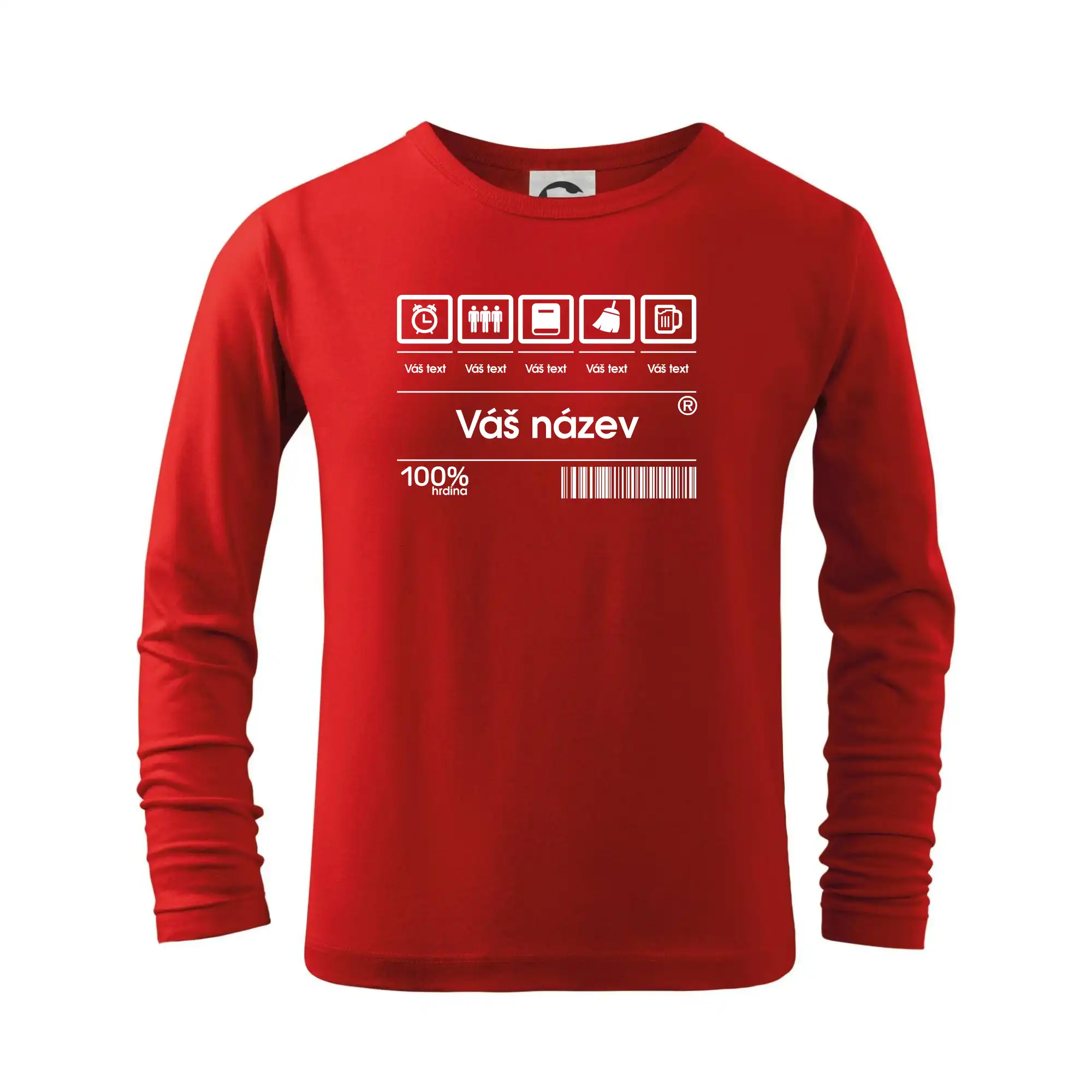 Do poznámky k objednávce nám napiš co chceš mít místo nápisu "vlastní text" a my doplníme ikonky, texty a budeš moct darovat naprosto originální triko. Tričko s originálním čárovým kódem pro každého. Čárový kód na přání!
