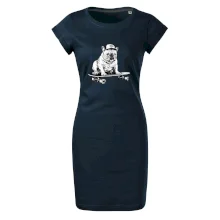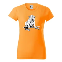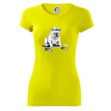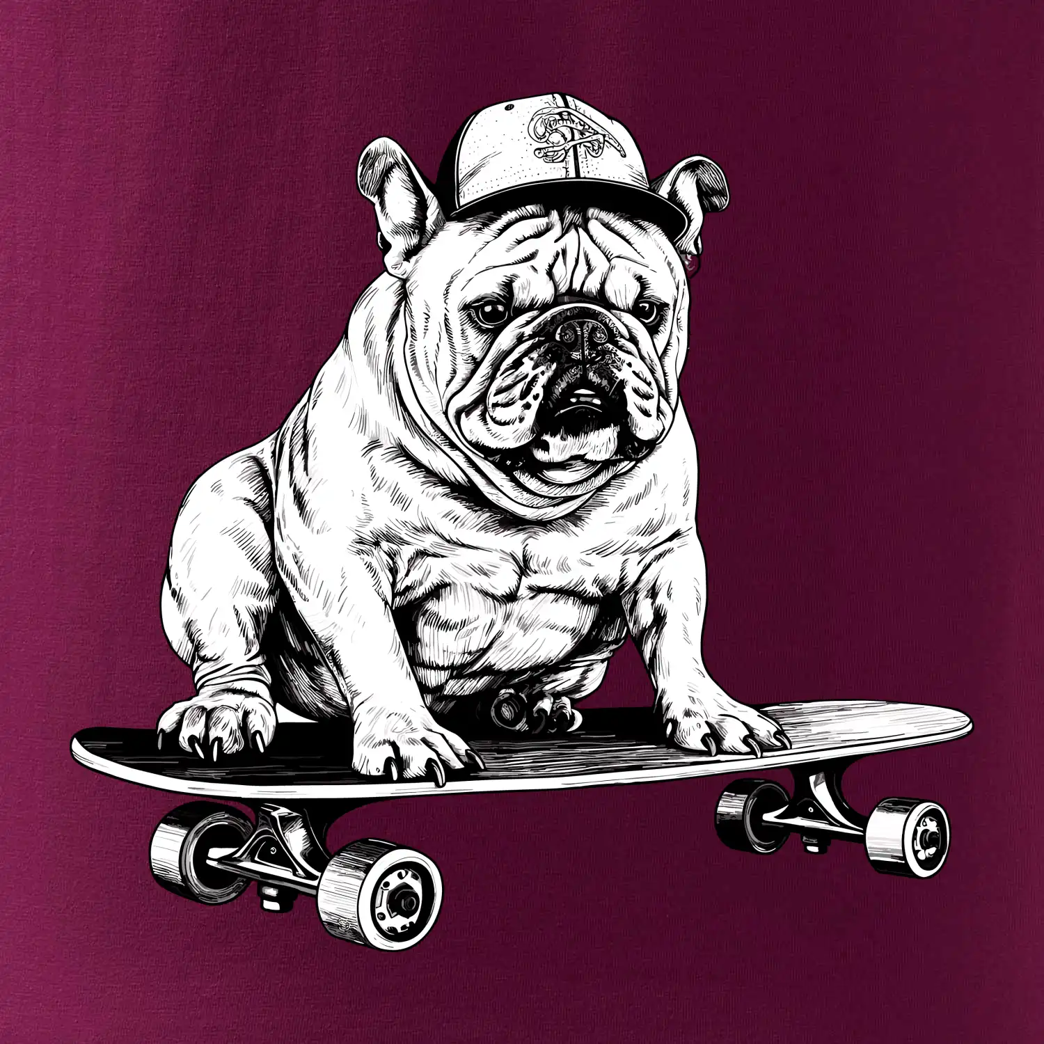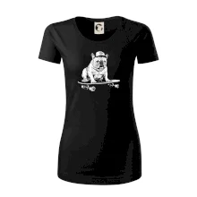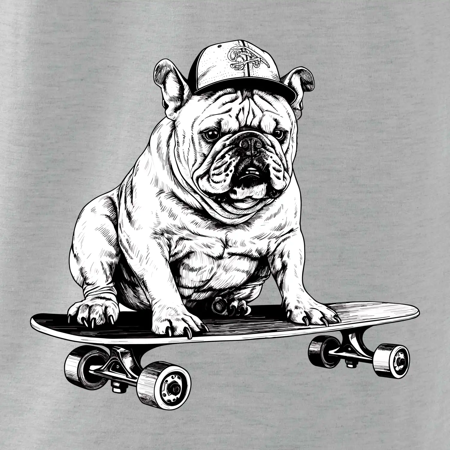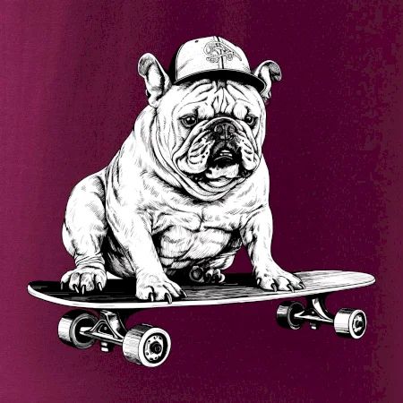Čiernobiely buldog na skateboarde