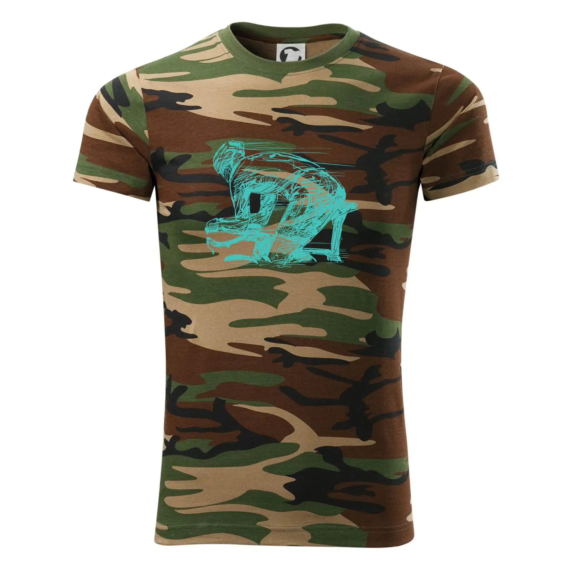 Tričko strednej gramáže vo farbách camouflage. Strih s bočnými švami. Lem priekrčníku z rebrového úpletu s prídavkom 5% elastanu. Vnútorná časť zadného priekrčníka začistená páskou vo farbe camouflage.