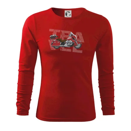 Tričko pre motorkára, na ktorom je červená cestovná motorka Amerika. Motorkárske tričko, kde je cestovná motorka, musí mať doma každý vášnivý motorkár. Tričko s motorkou je vhodný darček pre motorkára.