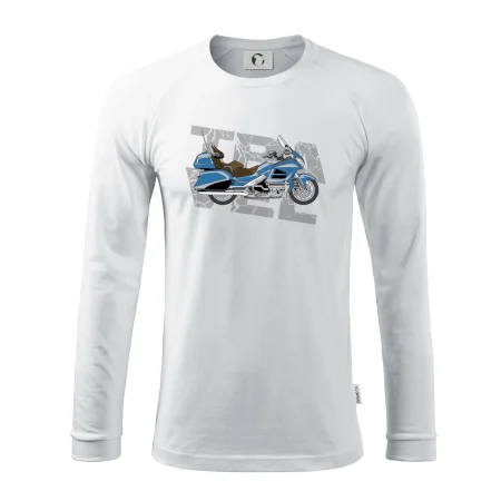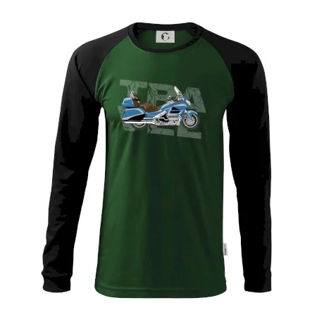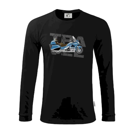 Tričko pre motorkára, na ktorom je modrá cestovná motorka Amerika. Motorkárske tričko, kde je cestovná motorka, musí mať doma každý vášnivý motorkár. Tričko s motorkou je vhodný darček pre motorkára.