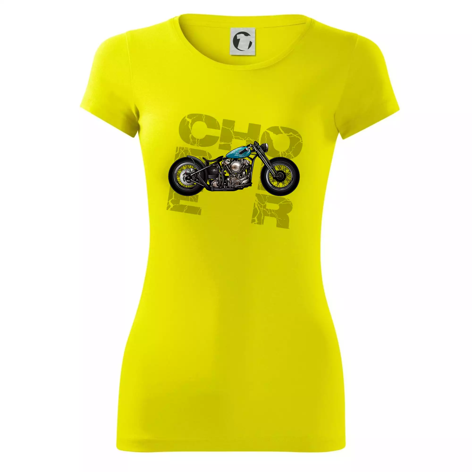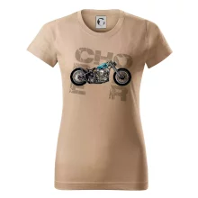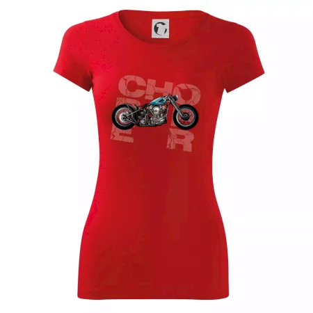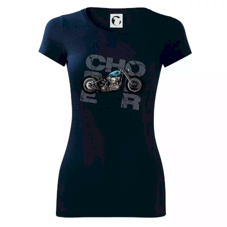 Tričko pre motorkárov, na ktorom je modrá motorka chopper. Motocykel by mal mať na tričku každý správny motorkár. Moto tričko s motorkou je vhodný darček pre motorkárov.