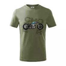 Tričko pre motorkárov, na ktorom je modrá motorka chopper. Motocykel by mal mať na tričku každý správny motorkár. Moto tričko s motorkou je vhodný darček pre motorkárov.