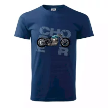 Tričko pre motorkárov, na ktorom je modrá motorka chopper. Motocykel by mal mať na tričku každý správny motorkár. Moto tričko s motorkou je vhodný darček pre motorkárov.