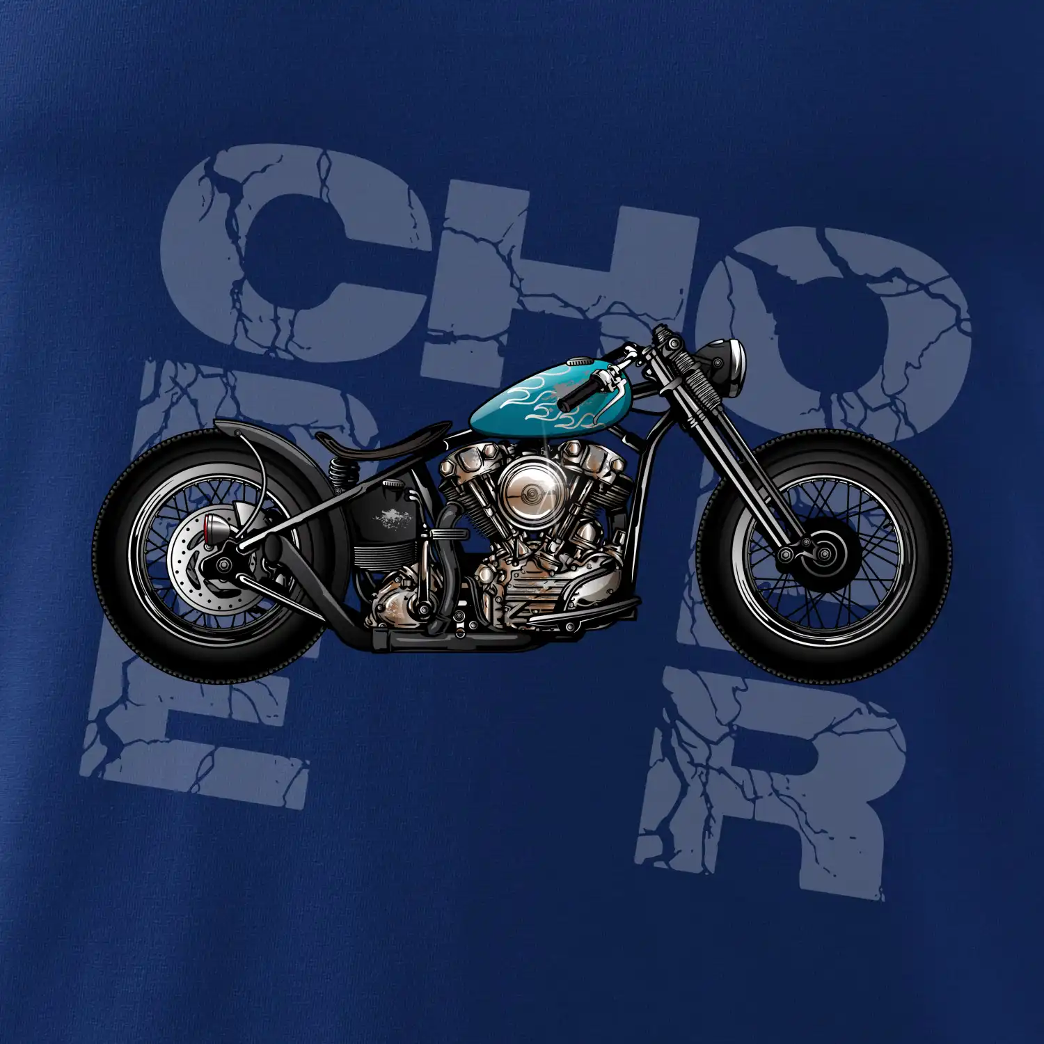 Tričko pre motorkárov, na ktorom je modrá motorka chopper. Motocykel by mal mať na tričku každý správny motorkár. Moto tričko s motorkou je vhodný darček pre motorkárov.