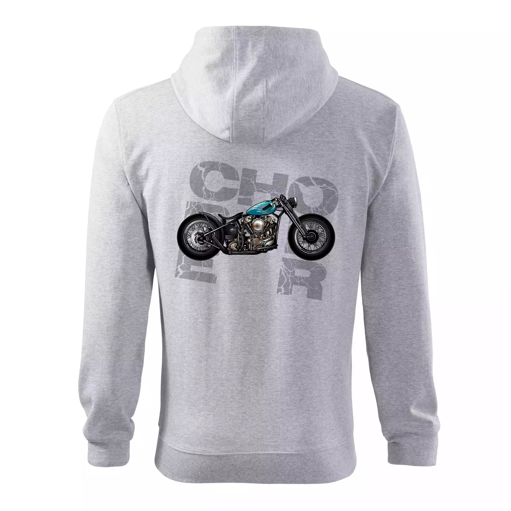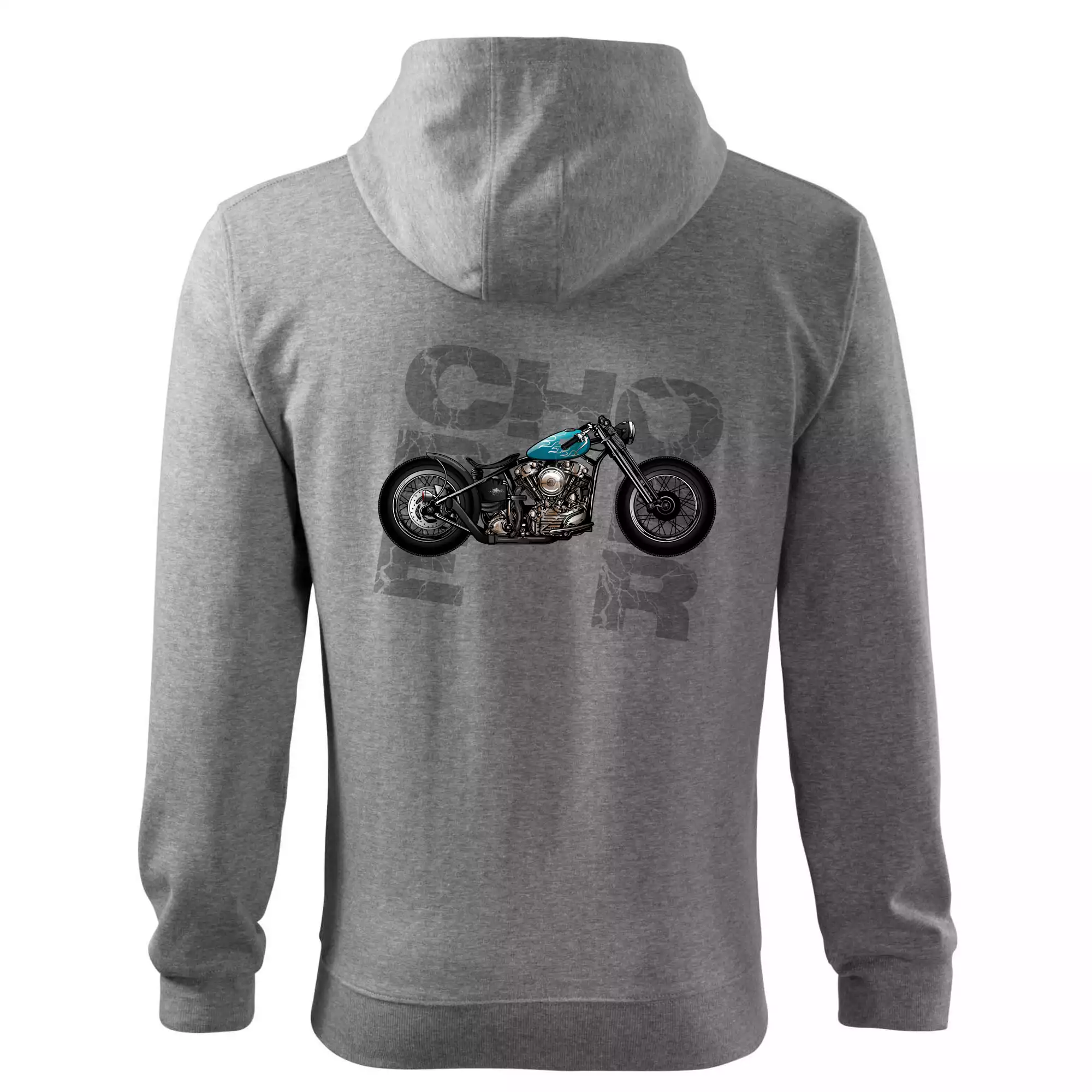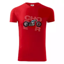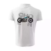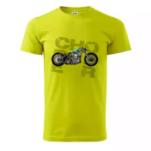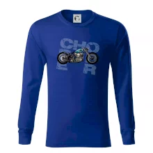 Tričko pre motorkárov, na ktorom je modrá motorka chopper. Motocykel by mal mať na tričku každý správny motorkár. Moto tričko s motorkou je vhodný darček pre motorkárov.