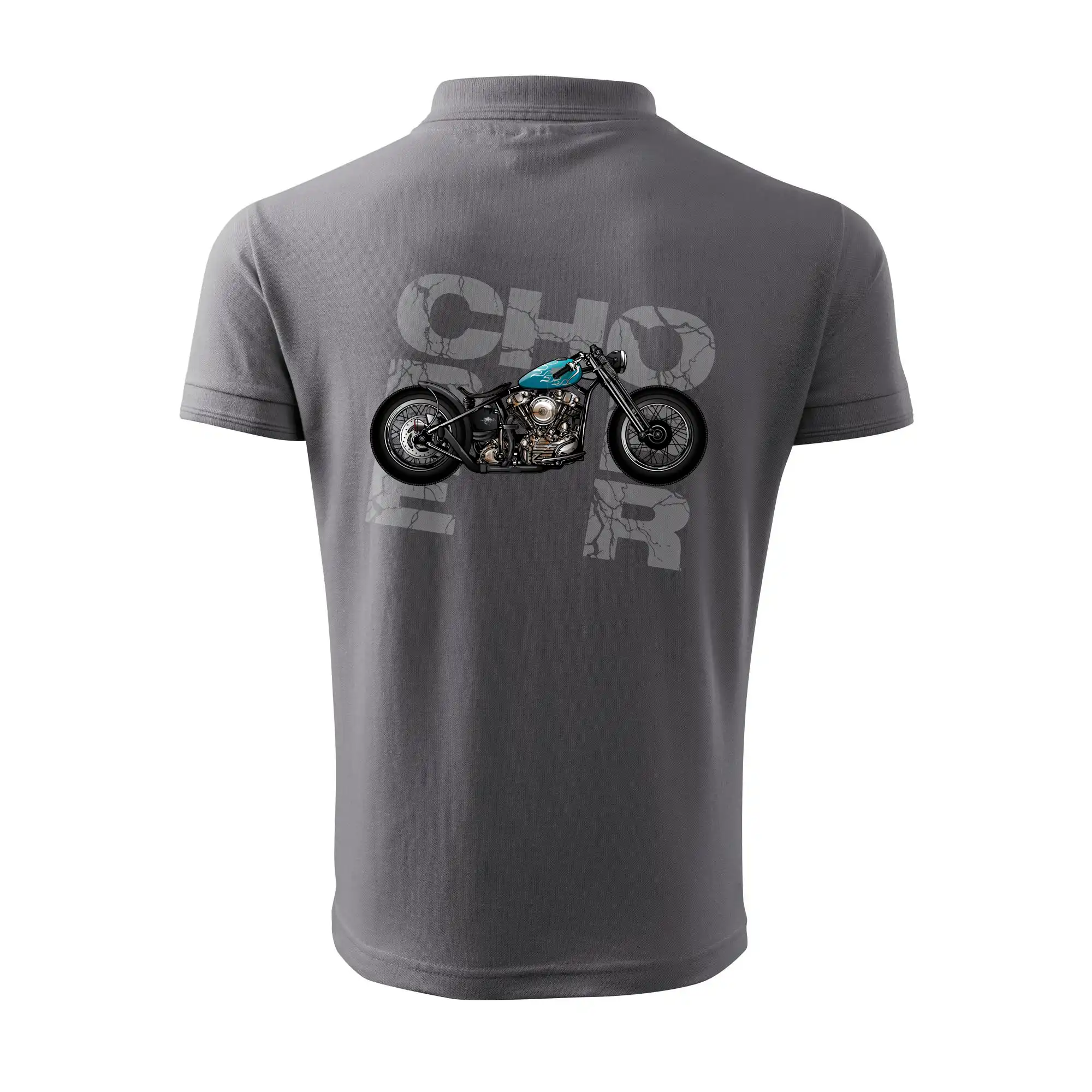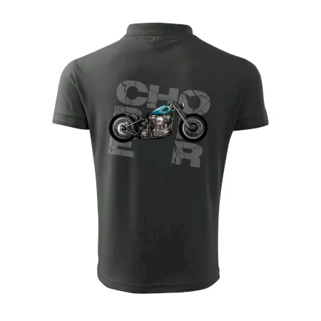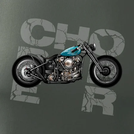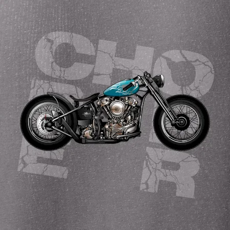 Tričko pre motorkárov, na ktorom je modrá motorka chopper. Motocykel by mal mať na tričku každý správny motorkár. Moto tričko s motorkou je vhodný darček pre motorkárov.