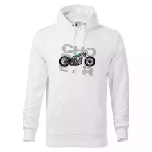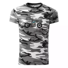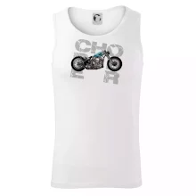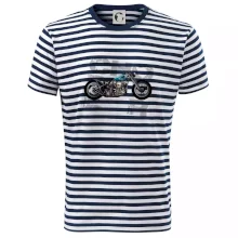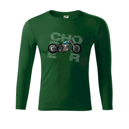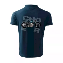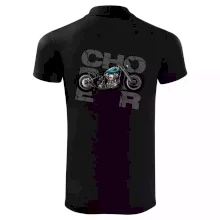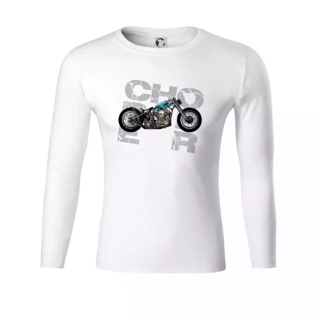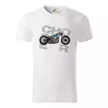 Tričko pre motorkárov, na ktorom je modrá motorka chopper. Motocykel by mal mať na tričku každý správny motorkár. Moto tričko s motorkou je vhodný darček pre motorkárov.