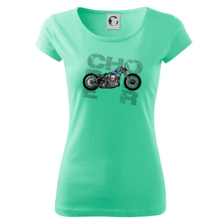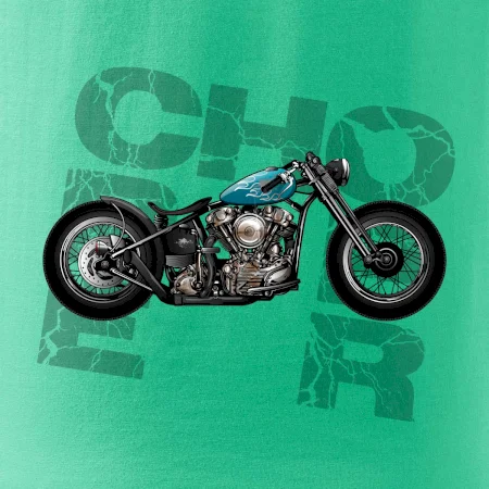 Tričko pre motorkárov, na ktorom je modrá motorka chopper. Motocykel by mal mať na tričku každý správny motorkár. Moto tričko s motorkou je vhodný darček pre motorkárov.
