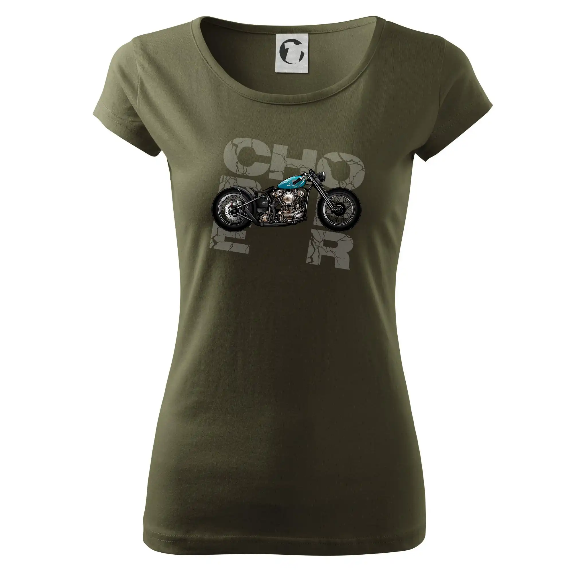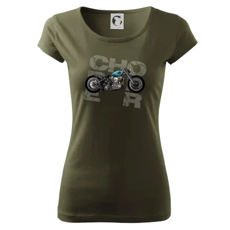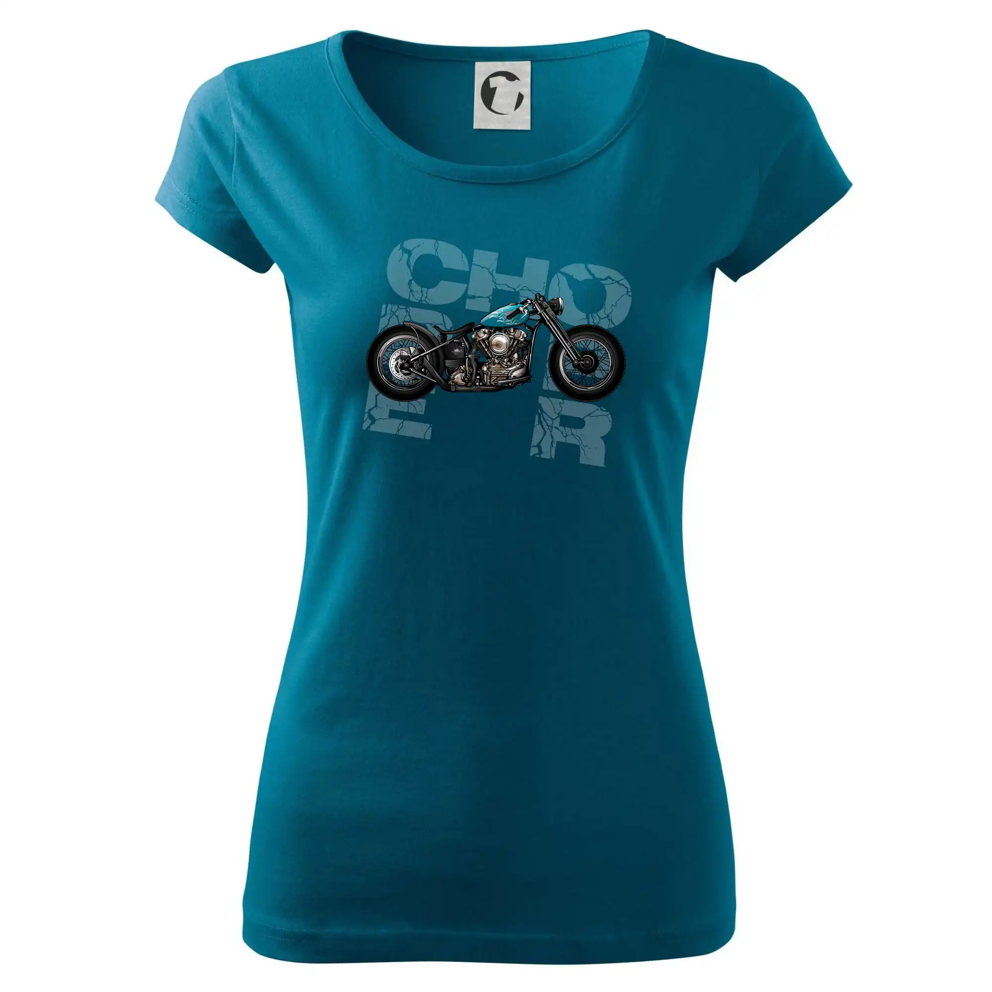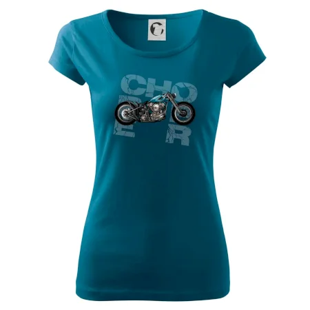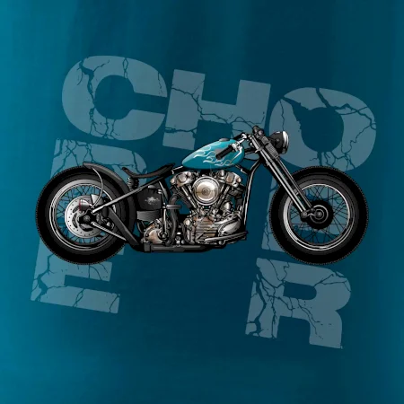 Tričko pre motorkárov, na ktorom je modrá motorka chopper. Motocykel by mal mať na tričku každý správny motorkár. Moto tričko s motorkou je vhodný darček pre motorkárov.