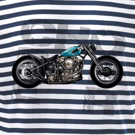 Tričko pre motorkárov, na ktorom je modrá motorka chopper. Motocykel by mal mať na tričku každý správny motorkár. Moto tričko s motorkou je vhodný darček pre motorkárov.