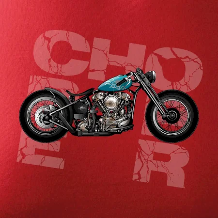 Tričko pre motorkárov, na ktorom je modrá motorka chopper. Motocykel by mal mať na tričku každý správny motorkár. Moto tričko s motorkou je vhodný darček pre motorkárov.