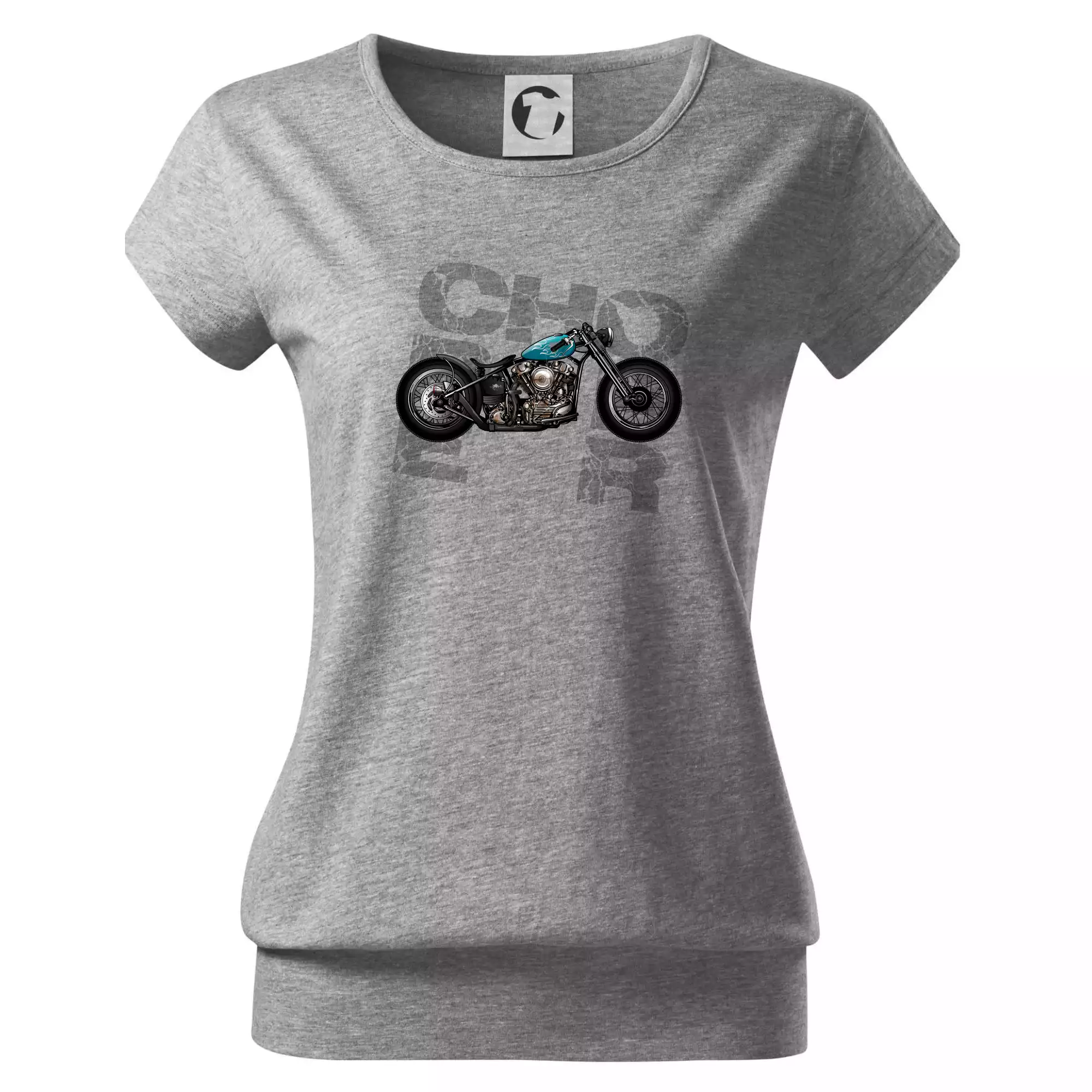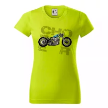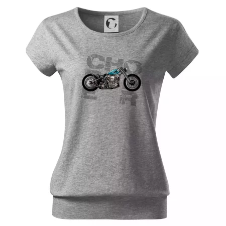 Tričko pre motorkárov, na ktorom je modrá motorka chopper. Motocykel by mal mať na tričku každý správny motorkár. Moto tričko s motorkou je vhodný darček pre motorkárov.