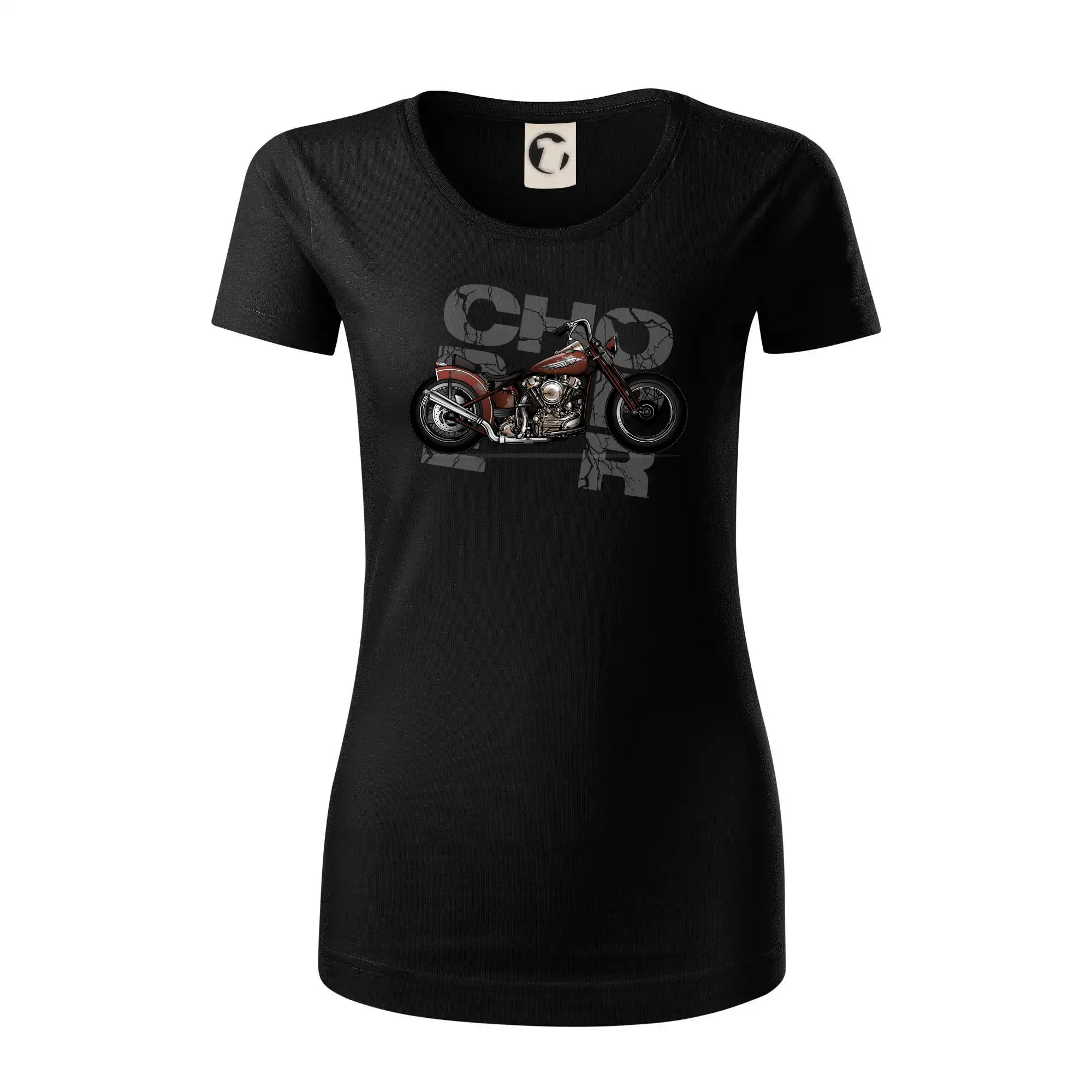 Tričko pre motorkárov, na ktorom je červená motorka chopper. Motocykel by mal mať na tričku každý správny motorkár. Moto tričko s motorkou je vhodný darček pre motorkárov.