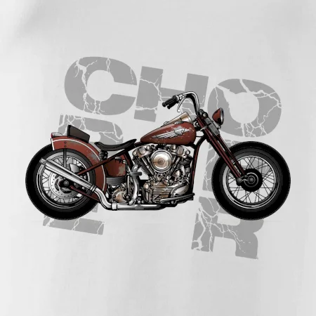 Tričko pre motorkárov, na ktorom je červená motorka chopper. Motocykel by mal mať na tričku každý správny motorkár. Moto tričko s motorkou je vhodný darček pre motorkárov.