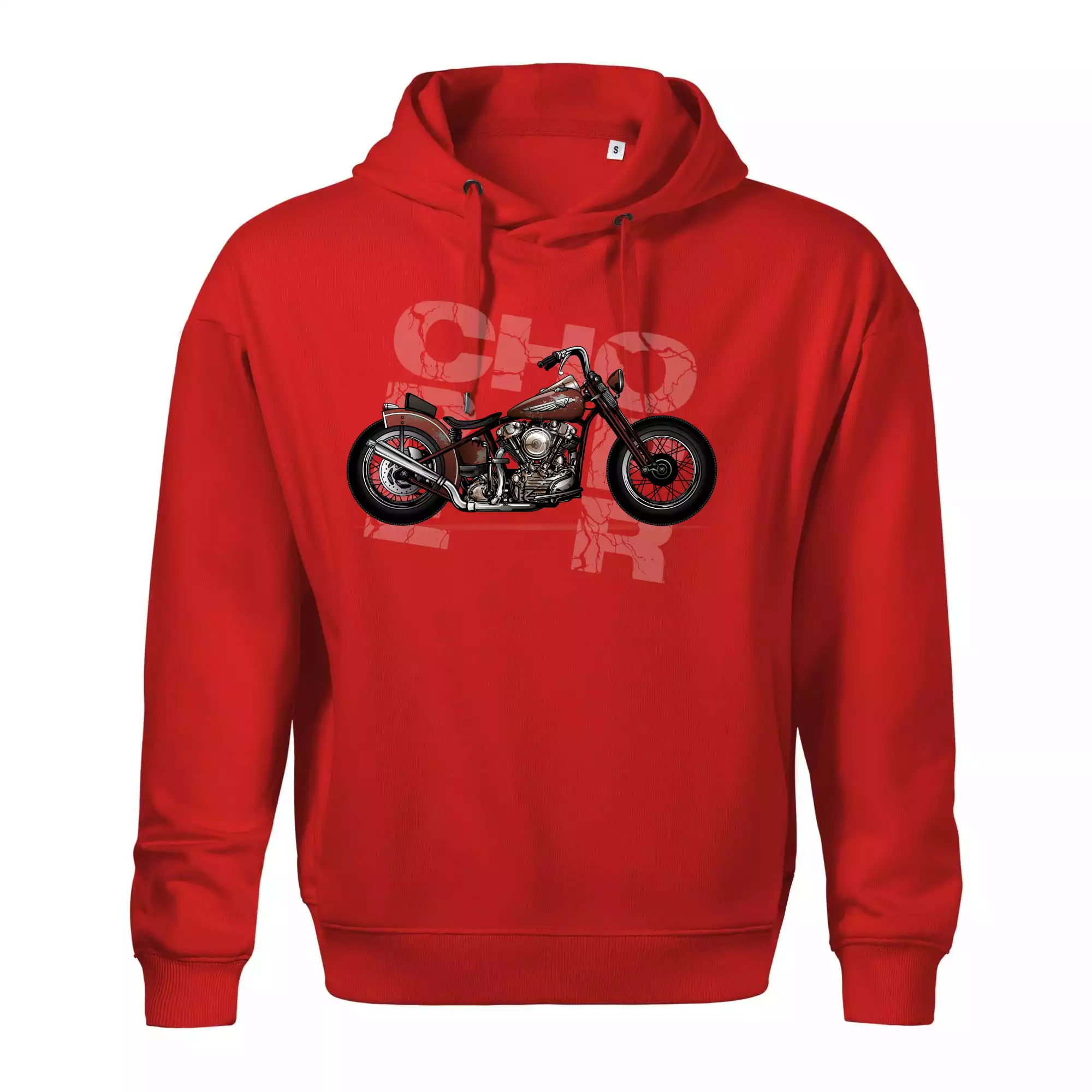 Tričko pre motorkárov, na ktorom je červená motorka chopper. Motocykel by mal mať na tričku každý správny motorkár. Moto tričko s motorkou je vhodný darček pre motorkárov.