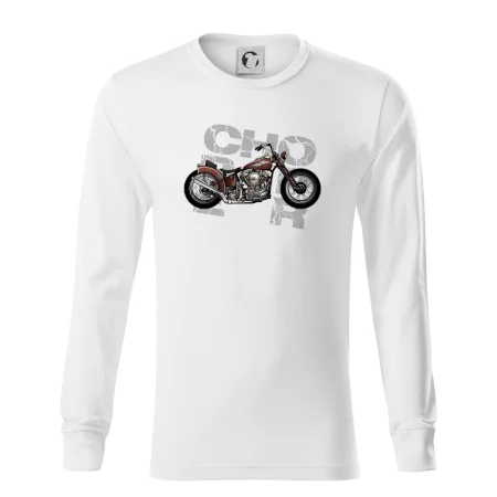Tričko pre motorkárov, na ktorom je červená motorka chopper. Motocykel by mal mať na tričku každý správny motorkár. Moto tričko s motorkou je vhodný darček pre motorkárov.
