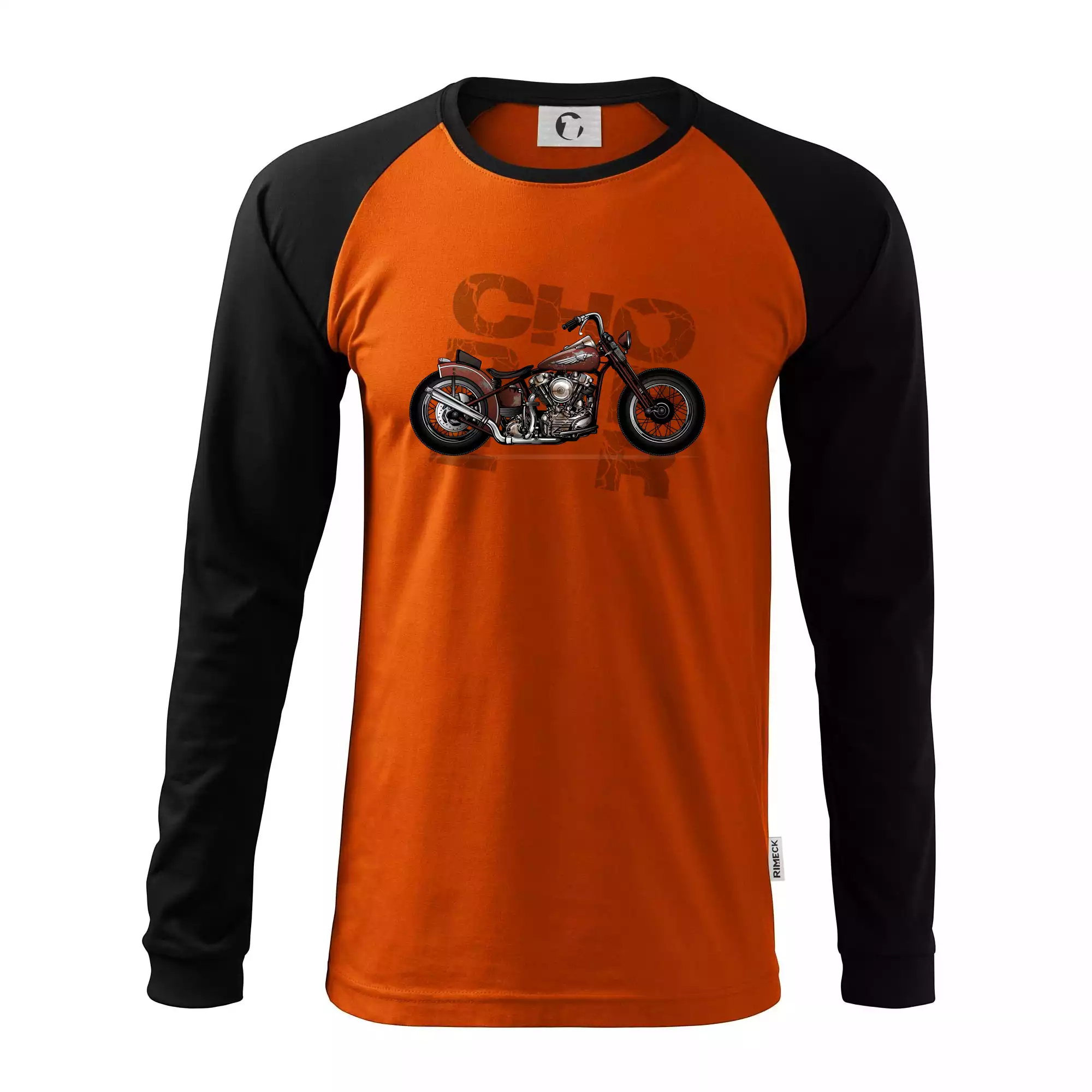 Tričko pre motorkárov, na ktorom je červená motorka chopper. Motocykel by mal mať na tričku každý správny motorkár. Moto tričko s motorkou je vhodný darček pre motorkárov.