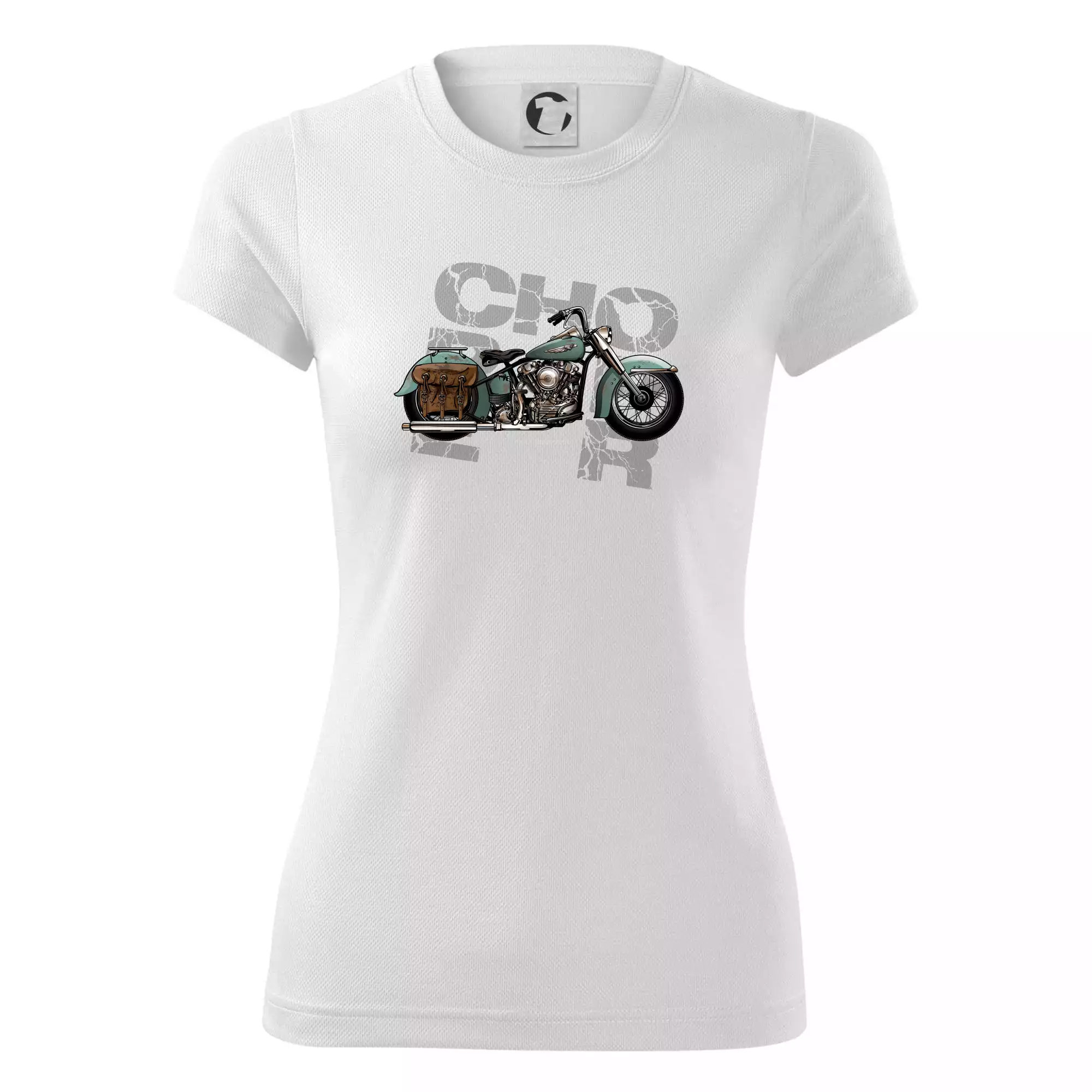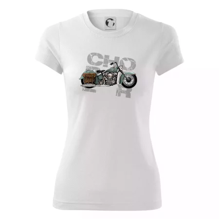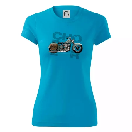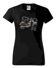 Tričko pre motorkárov, na ktorom je modrá motorka chopper s brašňou. Motocykel by mal mať na tričku každý správny motorkár. Moto tričko s motorkou je vhodný darček pre motorkárov.