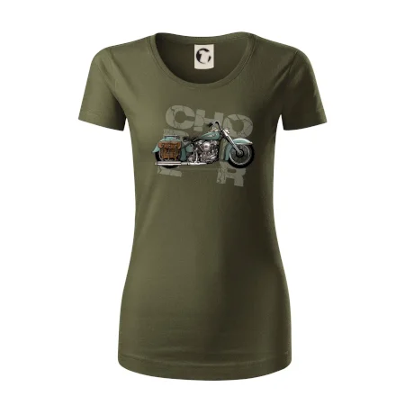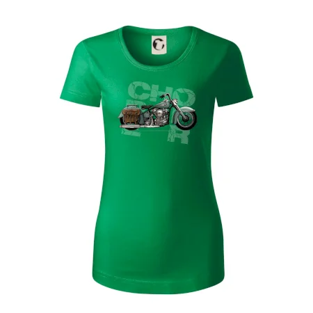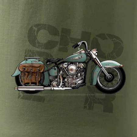 Tričko pre motorkárov, na ktorom je modrá motorka chopper s brašňou. Motocykel by mal mať na tričku každý správny motorkár. Moto tričko s motorkou je vhodný darček pre motorkárov.