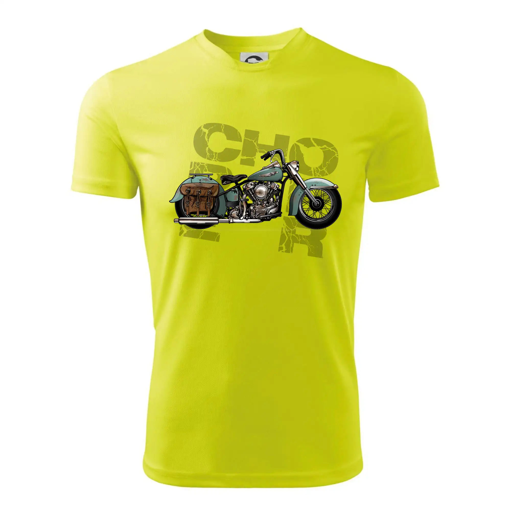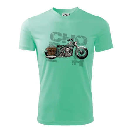 Tričko pre motorkárov, na ktorom je modrá motorka chopper s brašňou. Motocykel by mal mať na tričku každý správny motorkár. Moto tričko s motorkou je vhodný darček pre motorkárov.