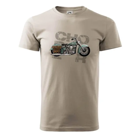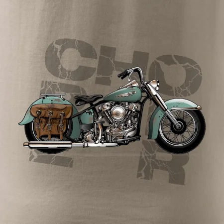 Tričko pre motorkárov, na ktorom je modrá motorka chopper s brašňou. Motocykel by mal mať na tričku každý správny motorkár. Moto tričko s motorkou je vhodný darček pre motorkárov.